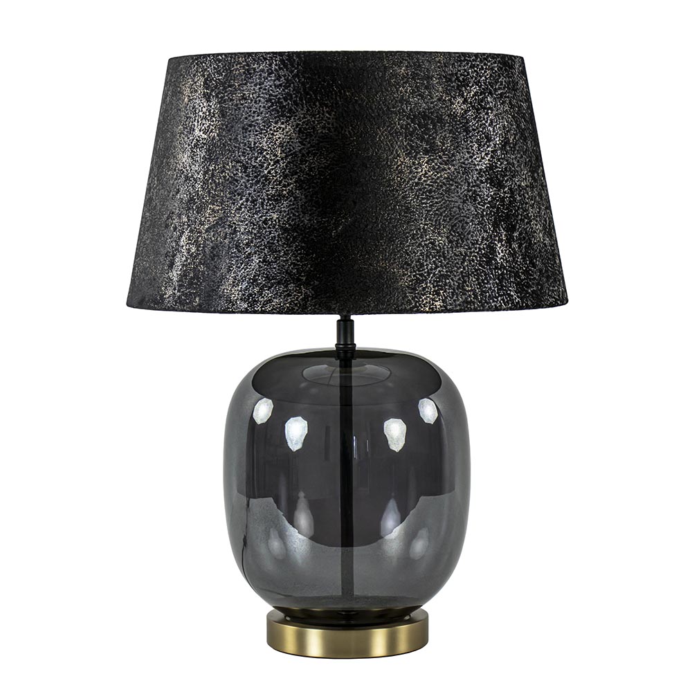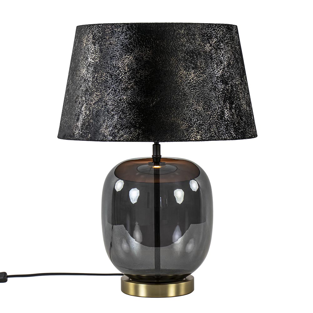 Deze prachtige lamp heeft een chique en luxe uitstraling door de combinatie van de materialen en kleuren. Zo heeft de tafellamp een glazen voet die is uitgevoerd in het zwart met een gouden accent. Dit is gecombineerd met een stoffen kap in het zwart/taupe met een glinstering erin. De combinatie maakt de tafellamp perfect geschikt voor een hotel chic, strak klassiek of luxury interieur. De kap wordt ondersteund door een kogelgewricht zodat u de kap goed recht kunt zetten. De glazen tafellamp met kap heeft een zwart snoer met een lengte van 180 cm en een knipschakelaar op 30 cm. De chique tafellamp wordt geleverd zonder lichtbron.
