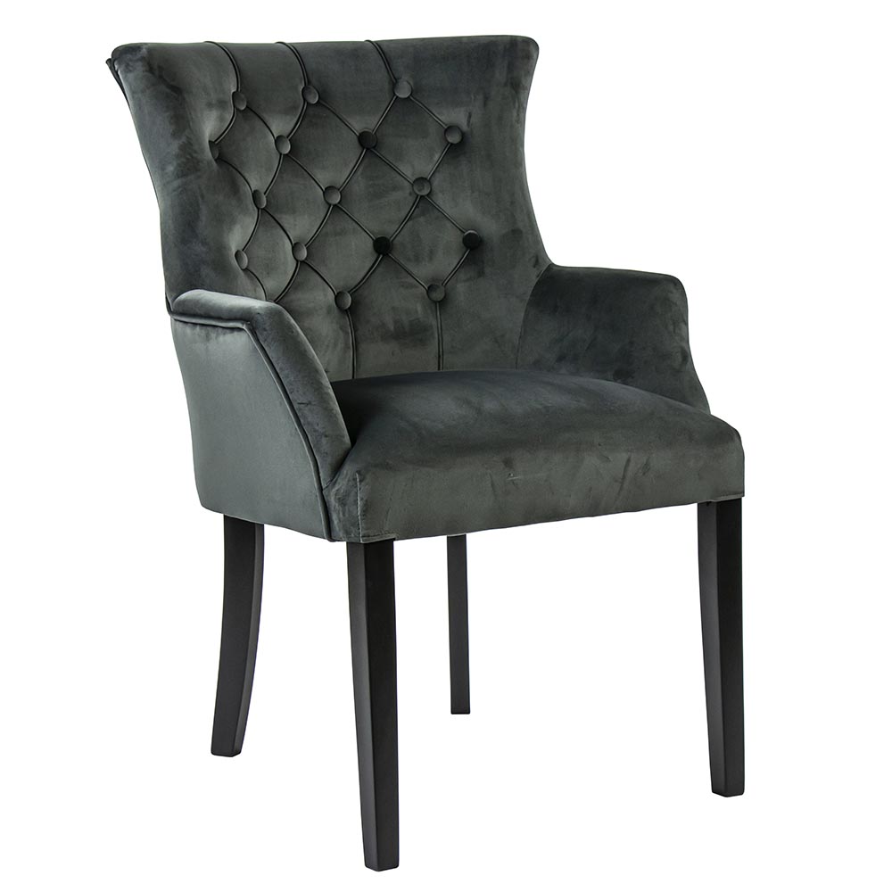 Met deze comfortabele armstoel wordt dineren een waar genot. De eetkamerstoel heeft een hoog zitcomfort en biedt door de hoge rugleuning en de armleuning veel ondersteuning. De zitting is uitgevoerd in stof in een velourse kwaliteit en is mooi gecombineerd met een zwarte houten poot. De rugleuning is aan de binnenzijde gecapitonneerd wat de stoel een chique klassieke uitstraling geeft.
