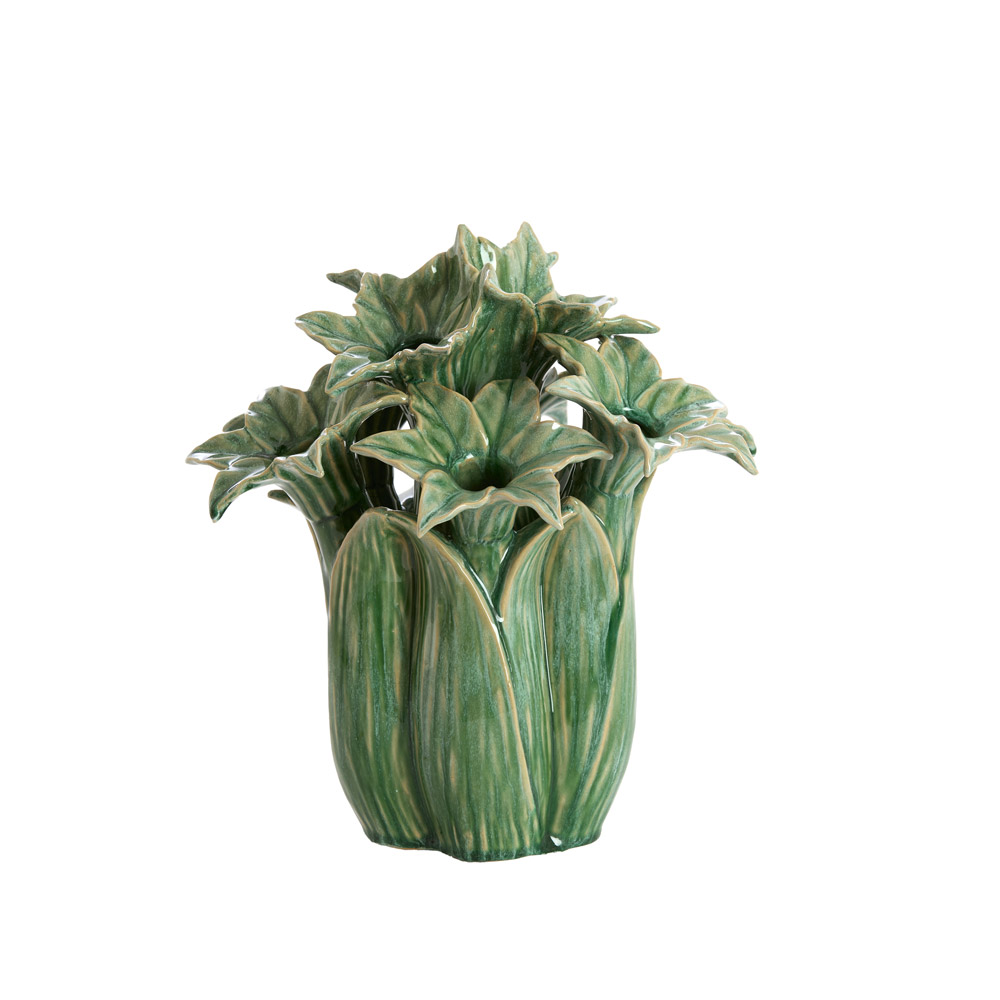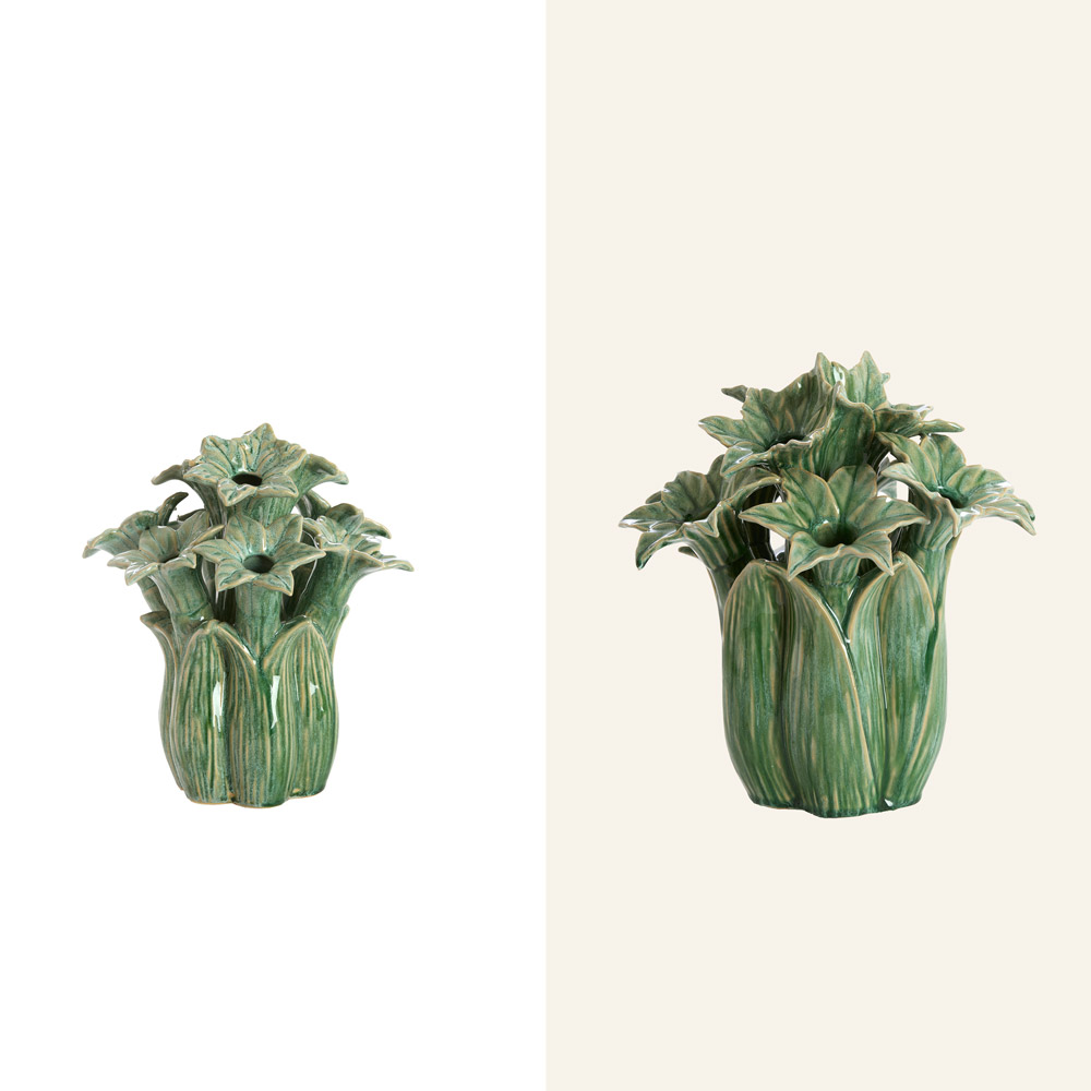 De Sampaga vaas is uitgevoerd in keramiek en valt direct op door haar speelse bloemvormige openingen. Dankzij de meerdere openingen kun je bloemen los van elkaar schikken, waardoor een boeket luchtig en natuurlijk verspreid staat. De groenblauw gemêleerde glazuurlaag met subtiele kleurnuances geeft de vaas een levendige en ambachtelijke uitstraling.