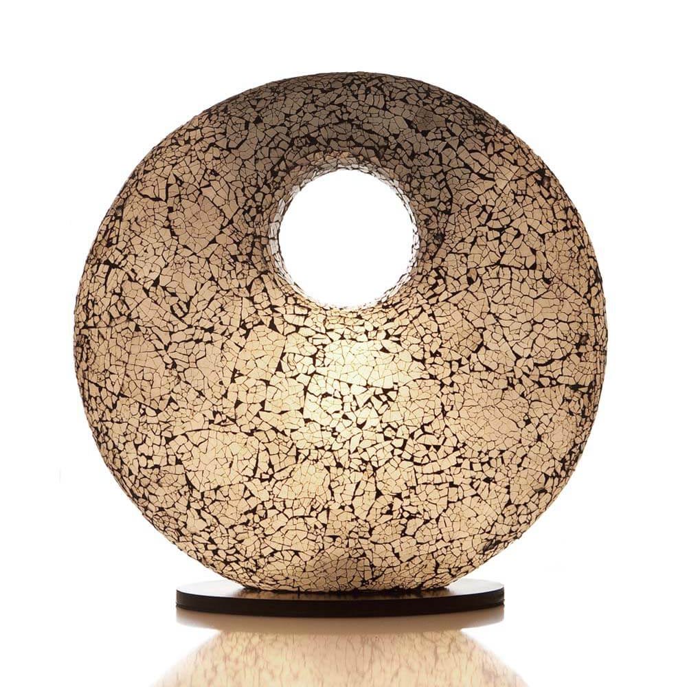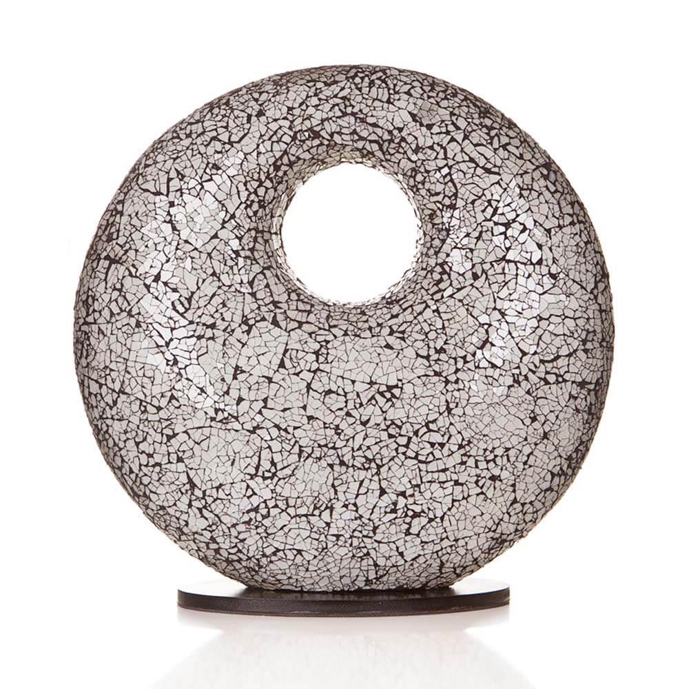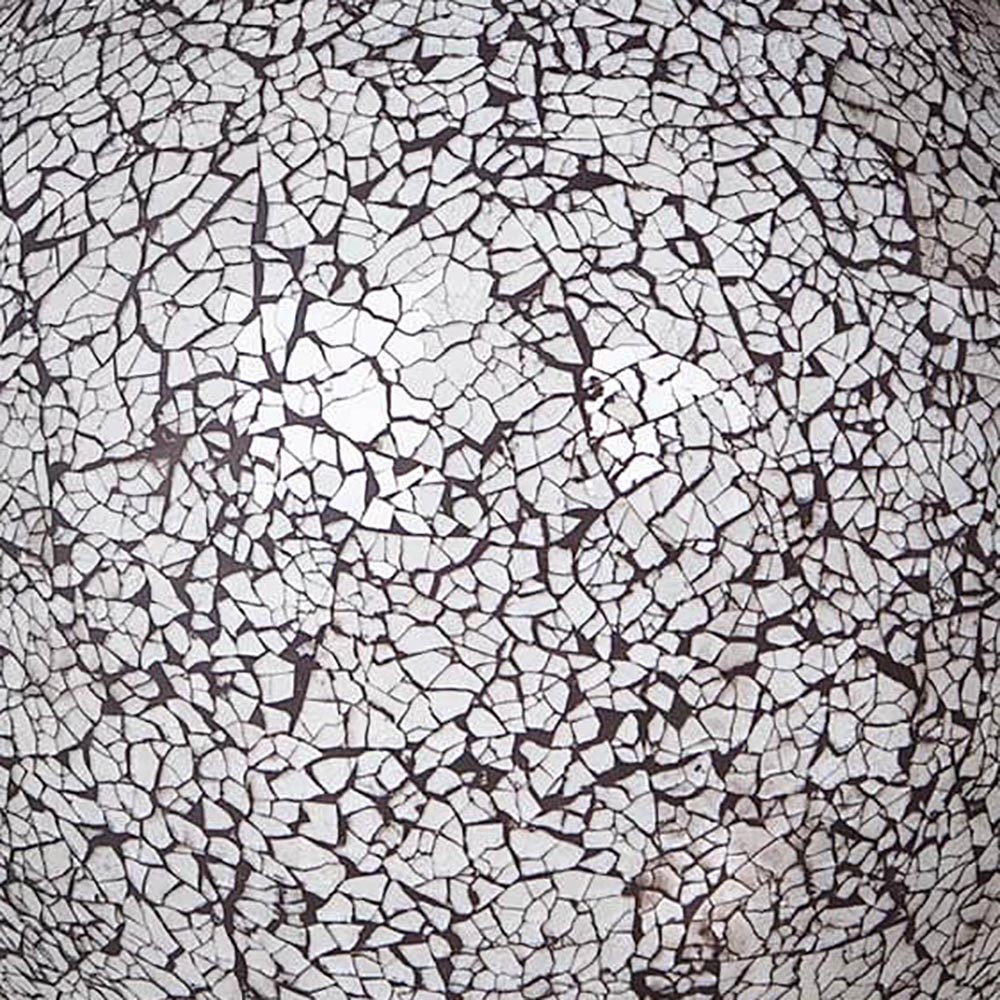 Deze lamp is gemaakt van gerecycled glas. De kleur van de lamp is wit met zwarte naden. De doorsnede van de lamp is 48 cm. Het zwarte snoer heeft een lengte van 182 cm incl. knippertje. De ovale voet heeft een afmeting van 29 x 15 cm. Deze lamp maakt deel uit van een leuke serie die bestaat uit diverse tafellampen en vloerlampen. De lamp is ook geschikt voor energiezuinige lichtbronnen zoals spaar- en led lampen.