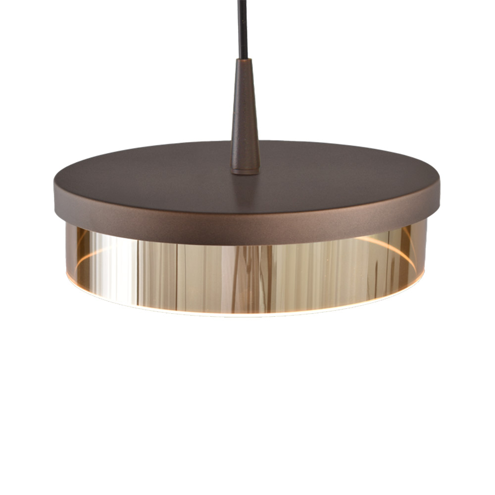 • Afmetingen: 100 x 10 x max. 160 cm (l x b x h) • Plafondbevestiging: 130 x 8 (l x d) • Schijven: Ø16 cm, met geïntegreerde LED • Kleur: Brons met gedimd glas • Materiaal: metaal & glas • Lichtbron: Geïntegreerde LED (inclusief) • Lichtkleur: Warm wit (2200-2700K) • Dimbaar: Ja, via externe fase-afsnijdimmer • Verstelbare snoeren