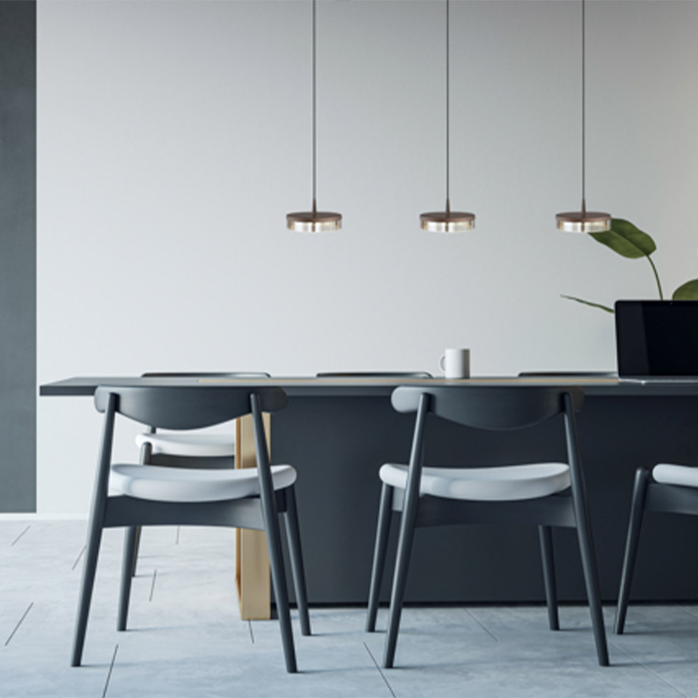 Deze exclusieve hanglamp belichaamt ingetogen elegantie en hoogwaardige afwerking. Het bronzen armatuur met strakke belijning draagt drie verfijnde lichtschijven met gedimd glas en een geïntegreerde diffuser. Dit zorgt voor een zachte, gelijkmatige verspreiding van het licht en een warme, uitnodigende sfeer – ideaal boven een kookeiland, eettafel of in een stijlvolle leefruimte.