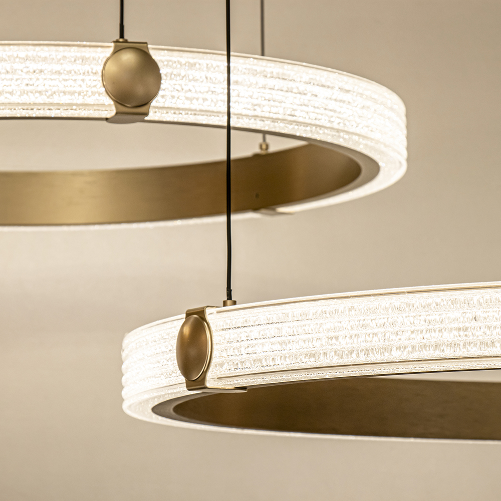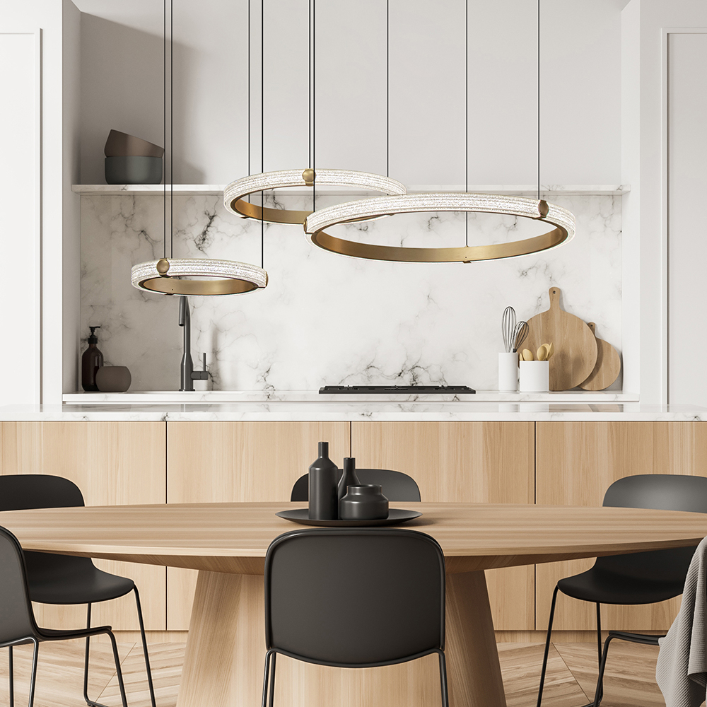 Deze prachtige design hanglamp heeft een elegante en luxe uitstraling. De lamp is samengesteld uit drie ringen die naar wens in hoogte zijn te verstellen. Doordat ze elkaar overlappen ontstaat er een speels effect. De ringen zijn uitgevoerd in het geborsteld goud met een kunststof rand aan de buitenzijde. Hier is een kristaleffect in verwerkt dat mooi oplicht als de lamp wordt ingeschakeld. Zo krijgt de moderne hanglamp een extra luxe uitstraling. De hanglamp ringen is dimbaar middels een externe dimmer (exclusief) en is een mooie toevoeging boven een langwerpige eettafel.