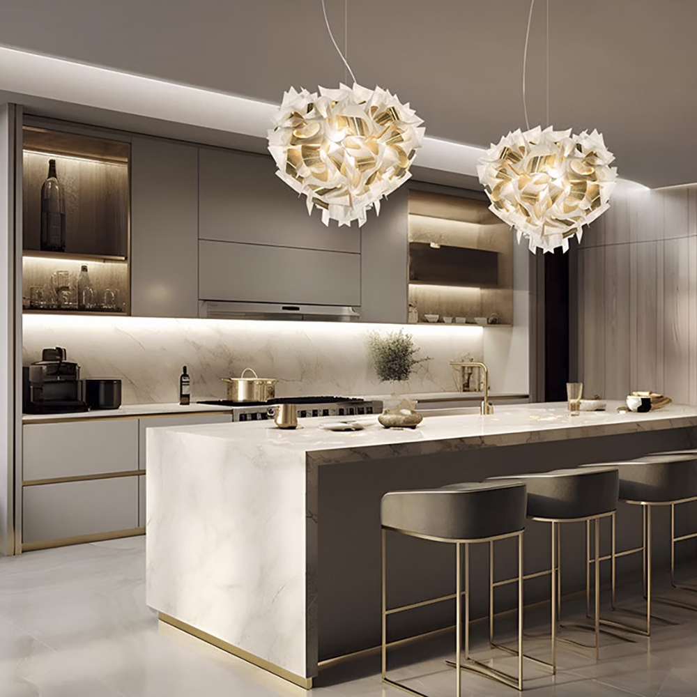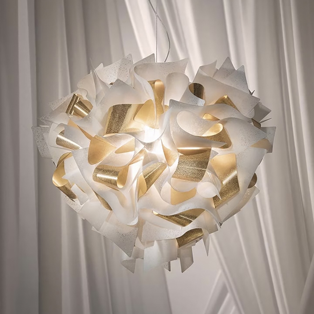 Prachtig van design, deze decoratieve hanglamp. De kap heeft een afmeting van 60×50 cm en is een ware eyecatcher te noemen. De kap is gemaakt van kunststof en uitgevoerd in het wit met goud. Dit geeft de design lamp een extra luxe uitstraling. De kap hangt aan een dunne kabel en een transparant snoer die beide naar wens zijn in te korten. De maximale hoogte van de designlamp is 190 cm. Ideaal voor boven een eettafel of in een ruimte met een hoog plafond. De wit met gouden design lamp is dimbaar middels een externe dimmer (exclusief) en wordt geleverd zonder lichtbronnen.