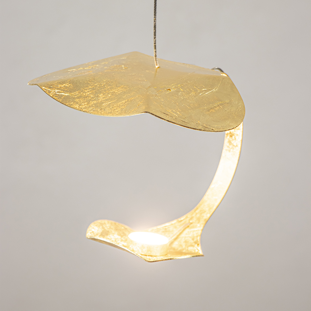 Deze prachtige design hanglamp is een verrijking voor het interieur. De 3-lichts hanglamp is gemaakt van metaal en voorzien van een goldleaf coating. Dit geeft de lamp een chique en luxe uitstraling. De lamp wordt aan het plafond bevestigd met een plaat van 24 cm doorsnede. Over de plaat zijn 3 snoeren verdeeld die naar wens op hoogte zijn te hangen. De maximale hoogte is 170 cm. De 3 kappen zijn voorzien van LED verlichting en geven een indirecte verspreiding. Met 850 lumen per kap zorgt de lamp voor voldoende licht. De LED designlamp is dimbaar middels de juiste dimmer (exclusief).