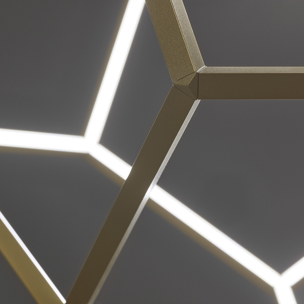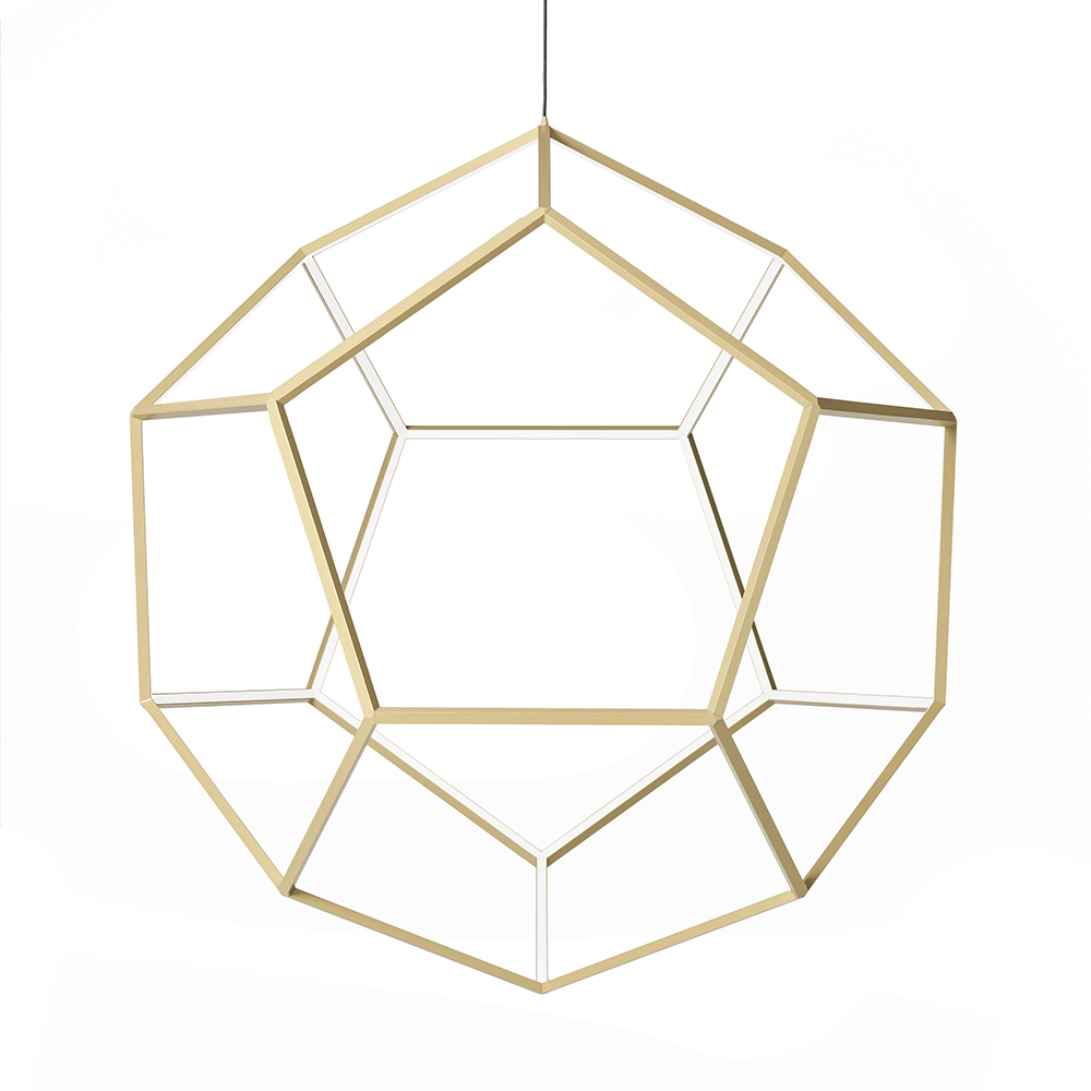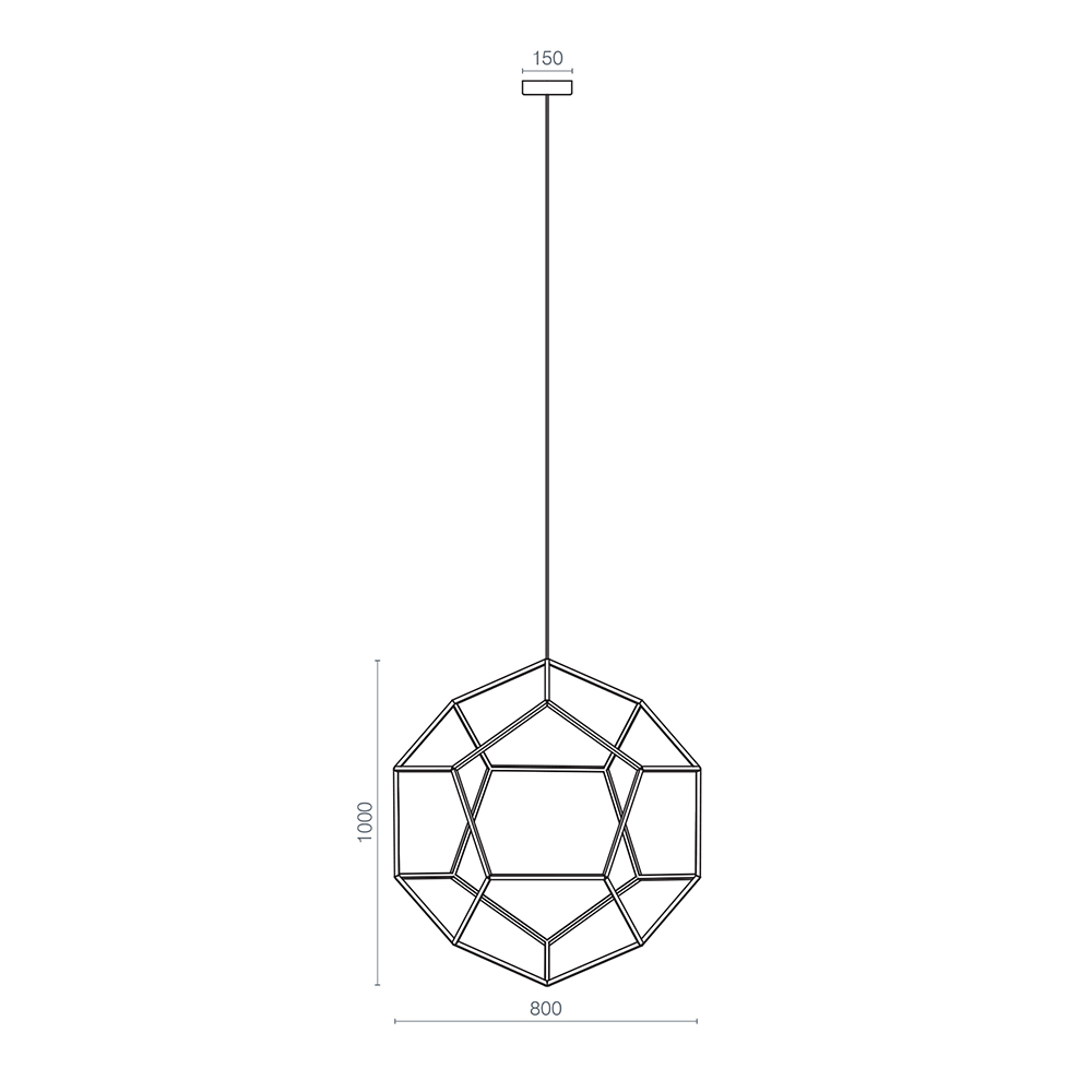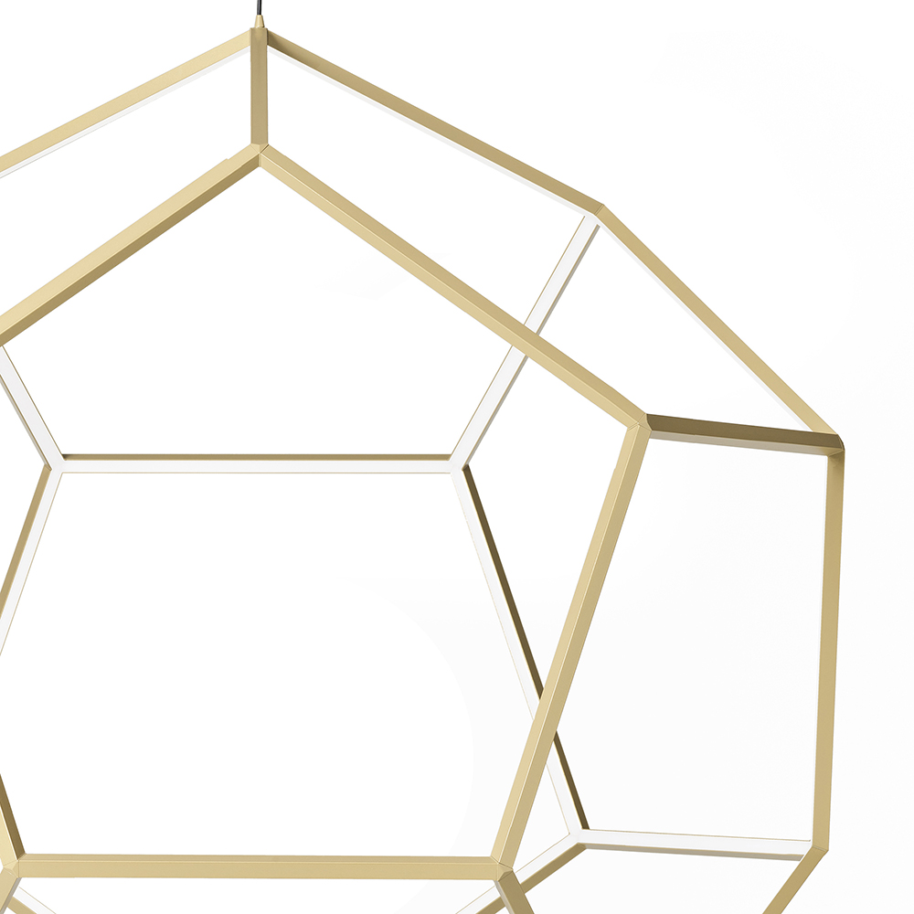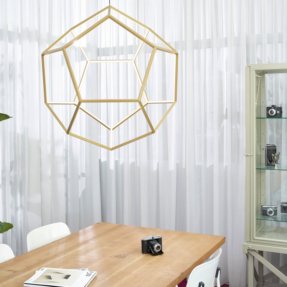 Geïnspireerd op de wiskundige vorm van een dodecaëder, maakt deze moderne hanglamp tot een waar schouwspel in de ruimte. De abstracte vorm en openheid van de lamp zorgt voor een luchtig geheel en maakt de lamp een met de ruimte. Het smalle frame van deze 12 vlakkerige kap behuist een LED strip die zorgt voor een mooi schouwspel aan licht. Doordat de lamp meerdere kanten op verlicht ontstaat er een prachtig lijnenspel aan schaduwen in de ruimte. De kap heeft een afmeting van 80×100 cm wat de lamp prima geschikt maakt voor boven een eettafel of in een vide. De moderne LED hanglamp is in hoogte verstelbaar en dimbaar middels een externe dimmer.