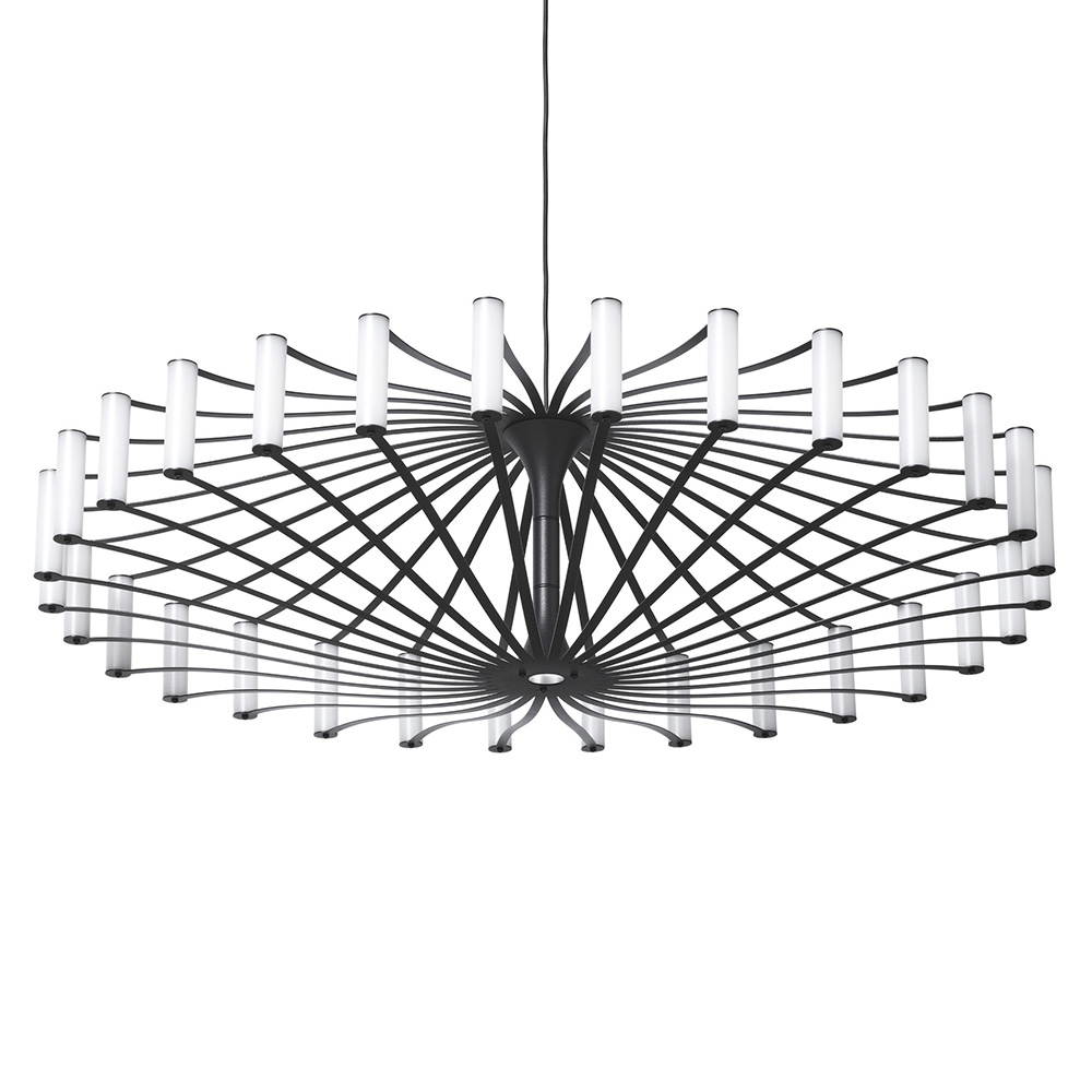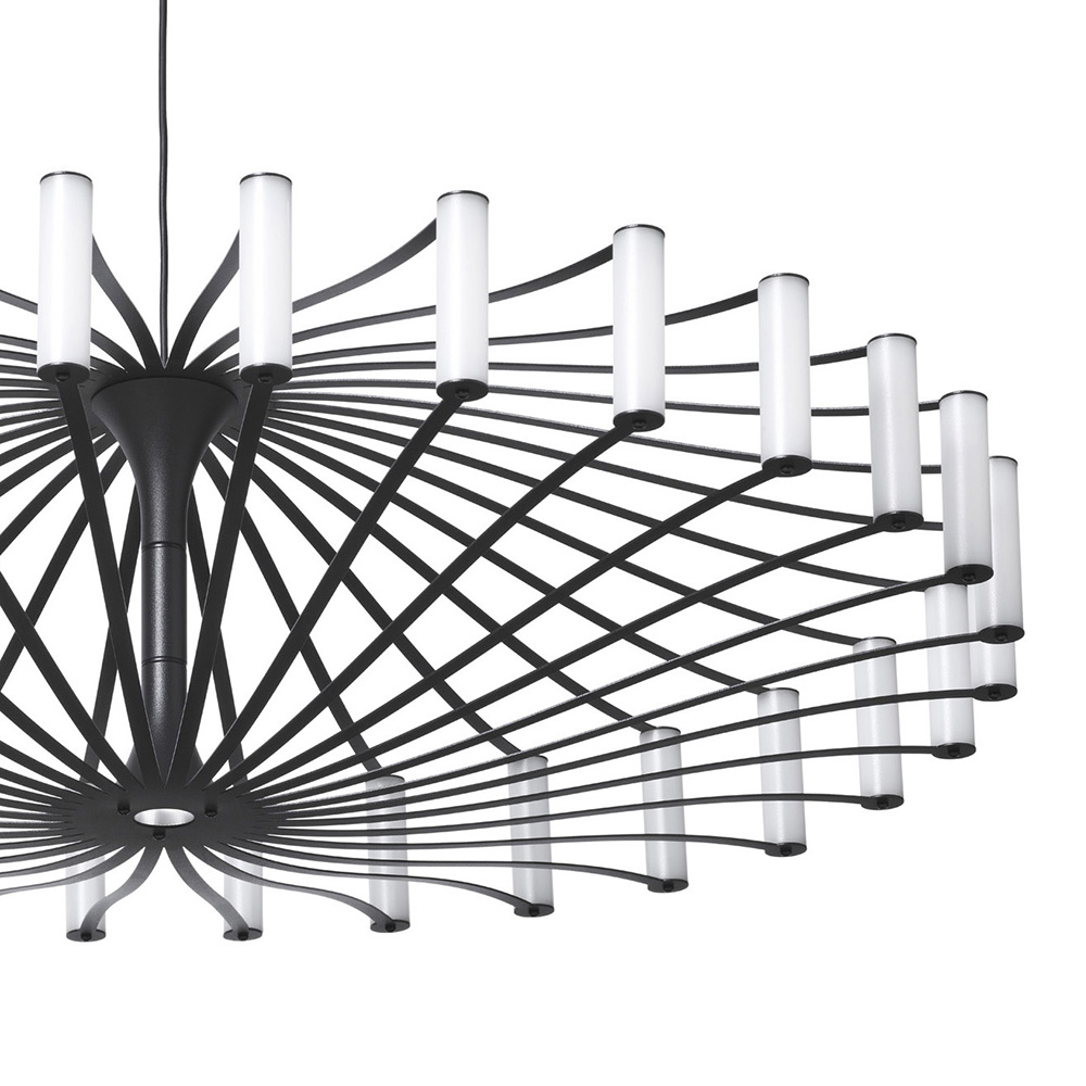 Dit iconische armatuur dankt zijn vorm en inspiratie aan een fascinatie voor wielrennen en met name het wiel. De design lamp heeft een zwart metalen armatuur dat is voorzien van 25 LED lichtpunten. 24 punten zijn rondom verdeeld en 1 punt is een spot aan de onderzijde van het armatuur. De spot aan de onderzijde zorgt dat de ruimte onder de lamp goed wordt verlicht en de andere lichtpunten zorgen voor een fijne diffuse lichtverspreiding. Door z’n grootte past de lamp mooi boven een eettafel of in een vide. De ronde designlamp is een ware eyecatcher in het interieur. De ronde hanglamp is dimbaar middels een externe dimmer (exclusief).