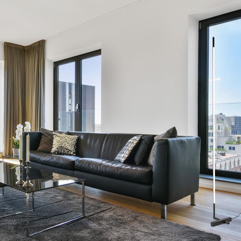 Een strak design met een sfeervol effect. Deze vloerlamp heeft een minimalistisch ontwerp maar valt wel degelijk op wanneer deze wordt ingeschakeld. De zwarte vloerlamp is in het armatuur voorzien van een LED strip welke naar wens kan worden gedraaid. Zo kunt u een mooie indirecte lichtverspreiding in de ruimte maken door de lamp naar de muur te richten. Ook kunt u de verlichting dimmen dmv de dimmer op het armatuur. Houdt deze ingedrukt totdat u de juiste intensiteit heeft. De zwarte LED vloerlamp heeft een zwart snoer met een lengte van 230 cm.