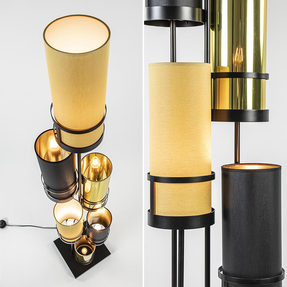 Een mooie designlamp met een luxe uitstraling. De moderne vloerlamp heeft een zwart metalen armatuur waarop trapsgewijs cilinder vormige kappen zijn verspreid. Deze zijn uitgevoerd in het zwart en goud in diverse tinten wat de lamp echt een luxury look geeft. Het leuke is dat u zelf kunt bepalen welke kap u waar plaatst. Zo kunt u de lamp steeds een beetje een andere look geven. De luxe vloerlamp is voorzien van een zwart snoer met een schakelaar en heeft een lengte van 180 cm. De lichtbronnen zijn exclusief.