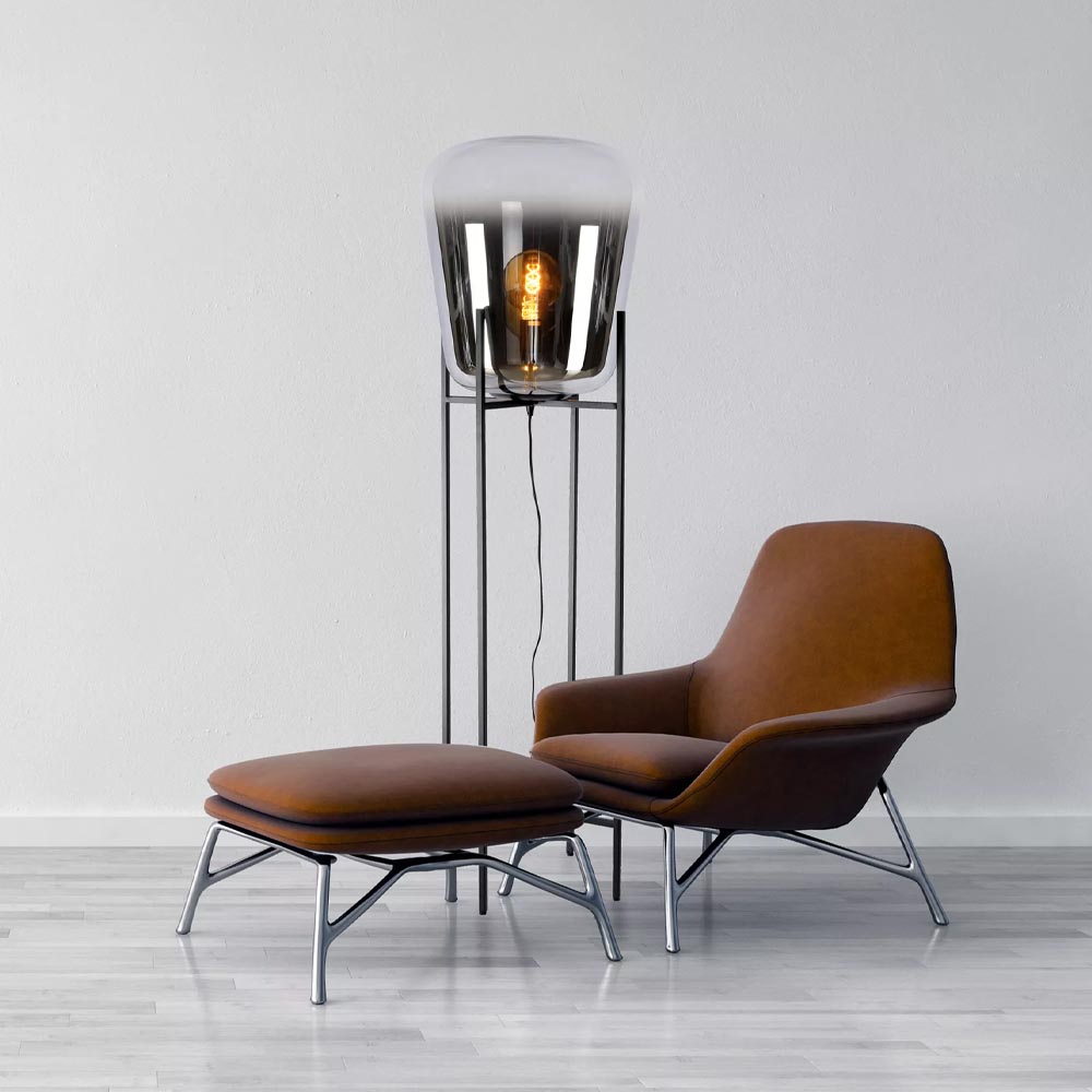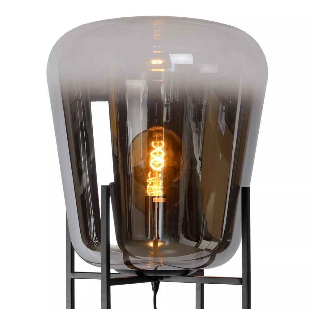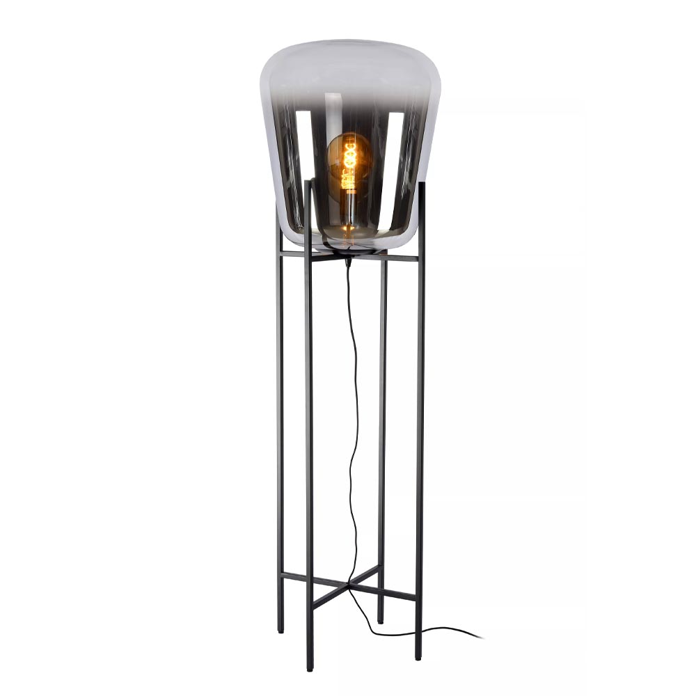 Deze elegante vloerlamp maakt het interieur helemaal af. De vloerlamp bestaat uit een metalen frame als voet die is uitgevoerd in het zwart en een smoke glazen kap met een verloop naar helder. Het donkere glas geeft de staande lamp een chique luxe uitstraling die mooi matcht met de huidige woontrends. De grote vloerlamp zorgt met diffuus licht voor een fijne sfeer. De glazen lamp is voorzien van een zwart snoer met een lengte van 180 cm. De lichtbron is exclusief.