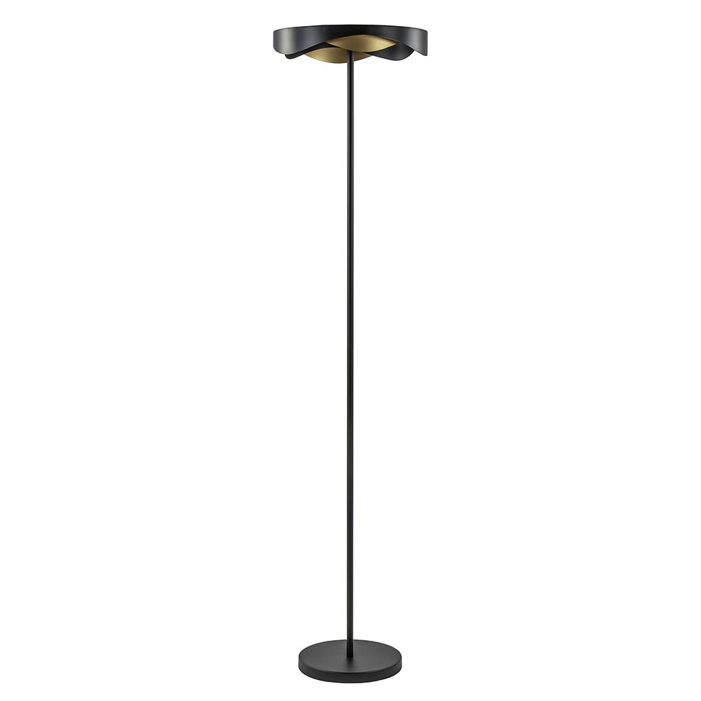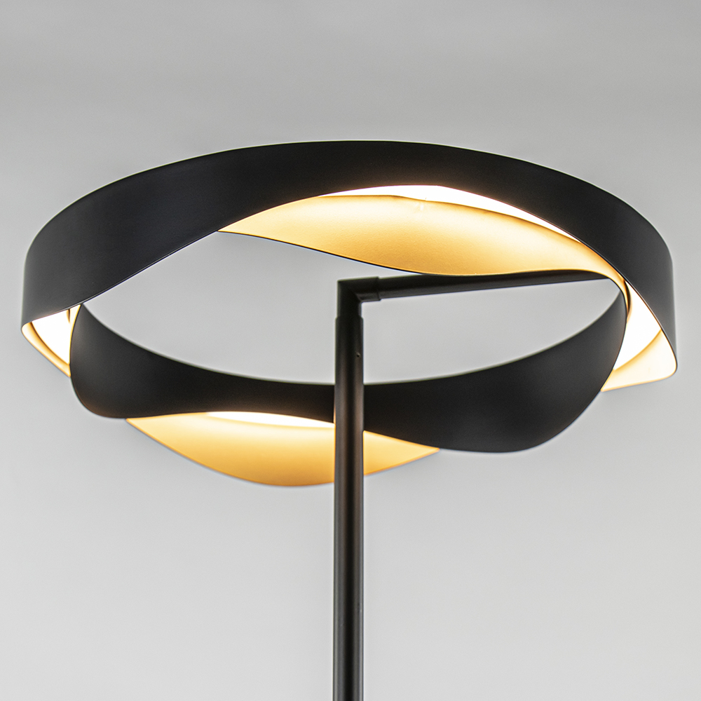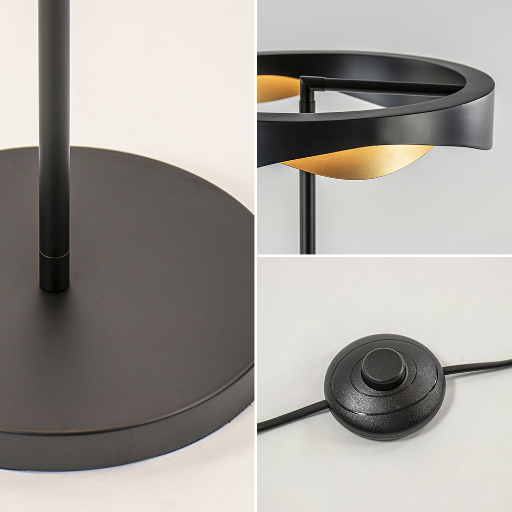 Een moderne vloerlamp met een strak design. De LED vloerlamp heeft een zwarte armatuur met goud accenten. De ring, die wordt ondersteund door de smalle voet, is van binnen voorzien van geïntegreerd LED welke dimbaar is dmv de dimmer in het snoer. Door deze ingedrukt te houden kunt u snel en gemakkelijk de juiste sfeer bepalen en veranderen. De moderne LED vloerlamp heeft een zwart snoer met een lengte van 260 cm, waarbij de dimmer zich op 80 cm van de voet bevindt. Een mooie toevoeging aan een strak klassiek, modern of chique interieur.