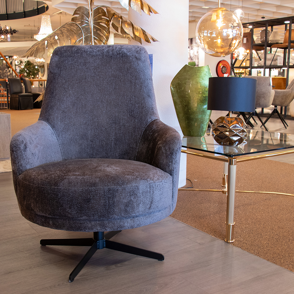 Heerlijk relaxen met een boek of onderuit voor de tv. Alles kan in deze fijne relax fauteuil. De draaibare fauteuil heeft een hoog zitcomfort en kan 360° draaien. Ideaal wanneer de stoel midden in de kamer staat. De fauteuil heeft een stoffing zitting die is uitgevoerd in het donker grijs. De zwart metalen poot maakt de armstoel helemaal af.