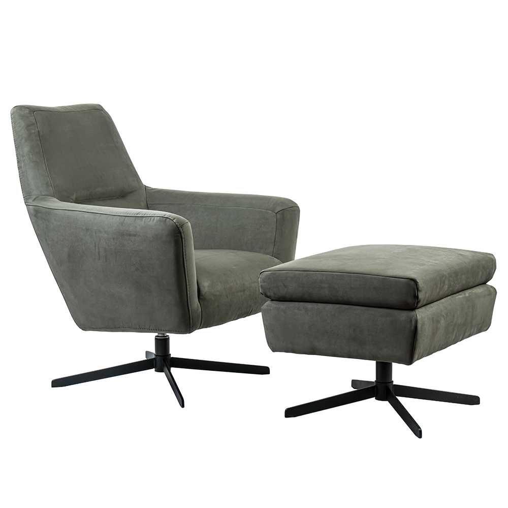 Een heerlijk relax fauteuil met een comfortabele zitting, armeleuningen en een hoge rugleuning. De zitting is volledig van stof en uitgevoerd in het grijs. Het fauteuil heeft een metalen kruispoot en is draaibaar voor extra comfort. Het voetenbankje is los verkrijgbaar (art: 14250007).