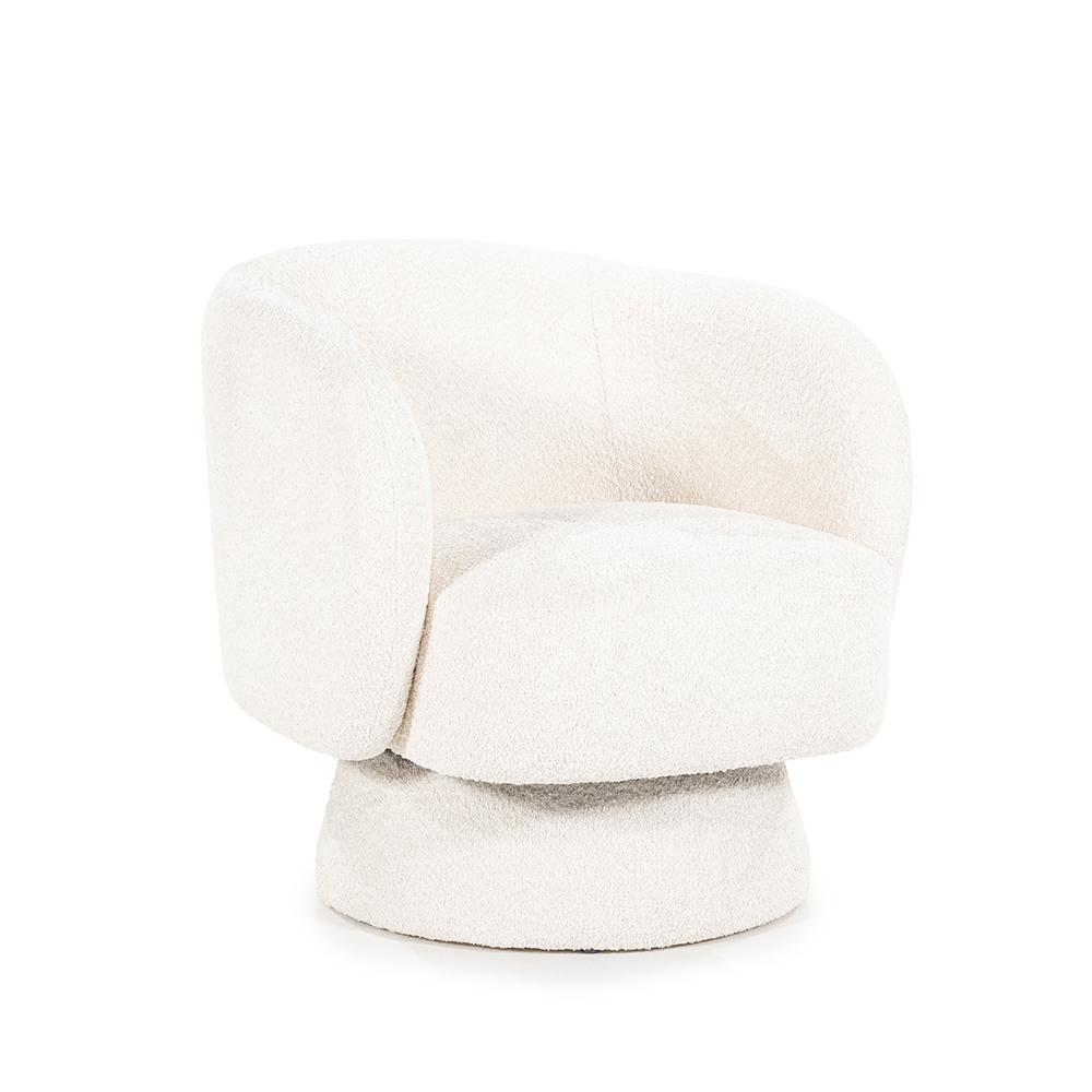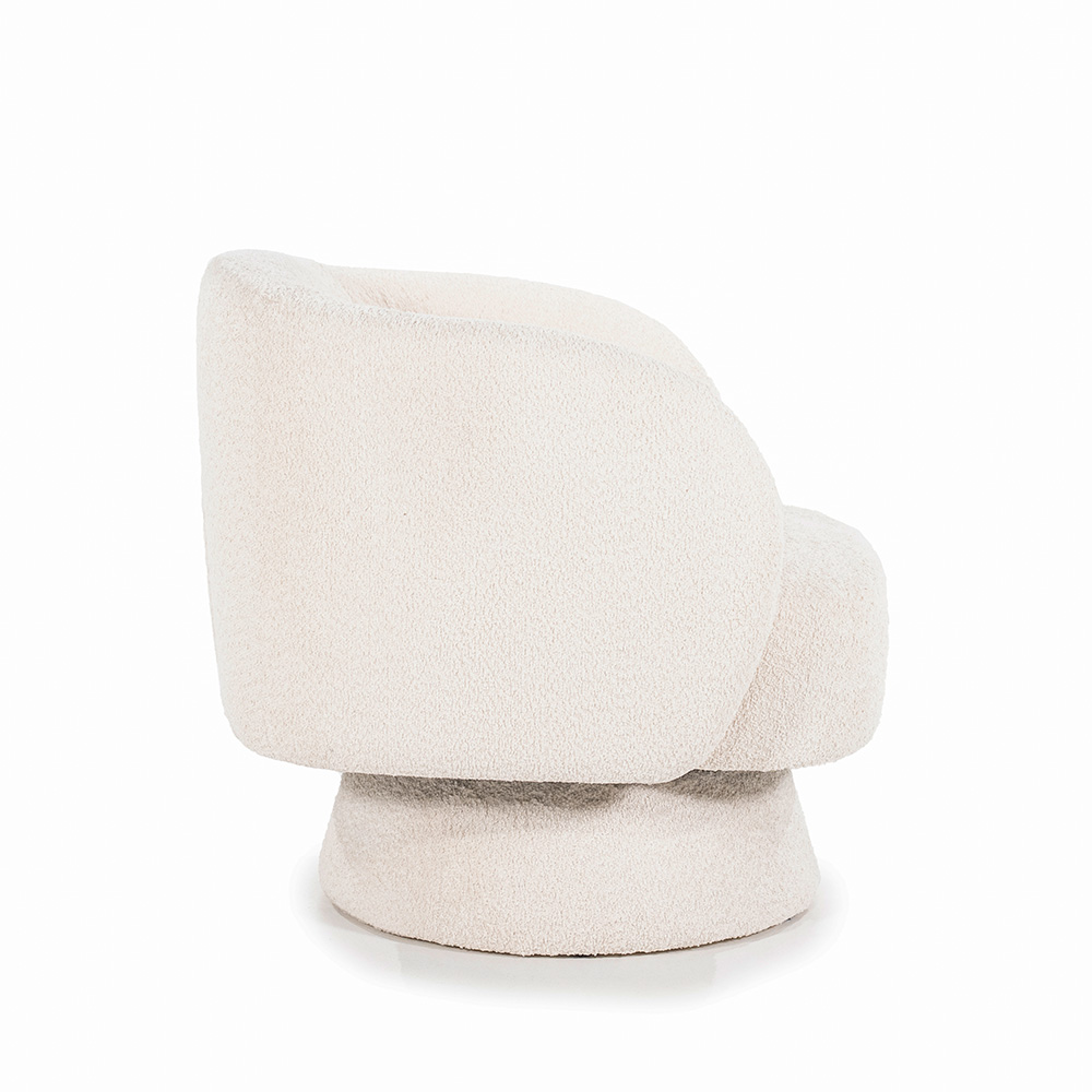 De “Balou” draaifauteuil in beige bouclé staat garant voor een uitnodigende zithoek. Met zijn ronde, enveloppante vormen en soepele draaibasis is hij perfect voor ontspannen leesmomenten of een gezellig praatje.
