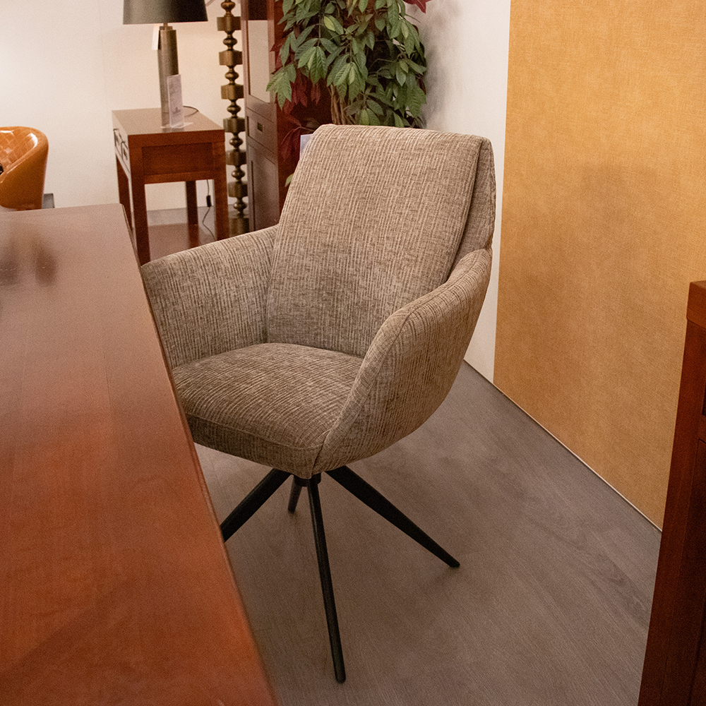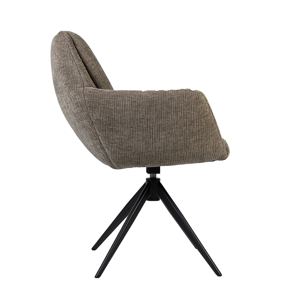 Deze eetkamerstoel zorgt voor maximaal comfort tijdens het dineren. De stoel is draaibaar en is voorzien van een return-system, waardoor de stoel automatisch weer terugdraait. De armstoel heeft een stoffen zitting die is uitgevoerd in de keur clay met een leuk subtiel patroon. Dit is verder mooi gecombineerd met chique mat zwarte poten.
