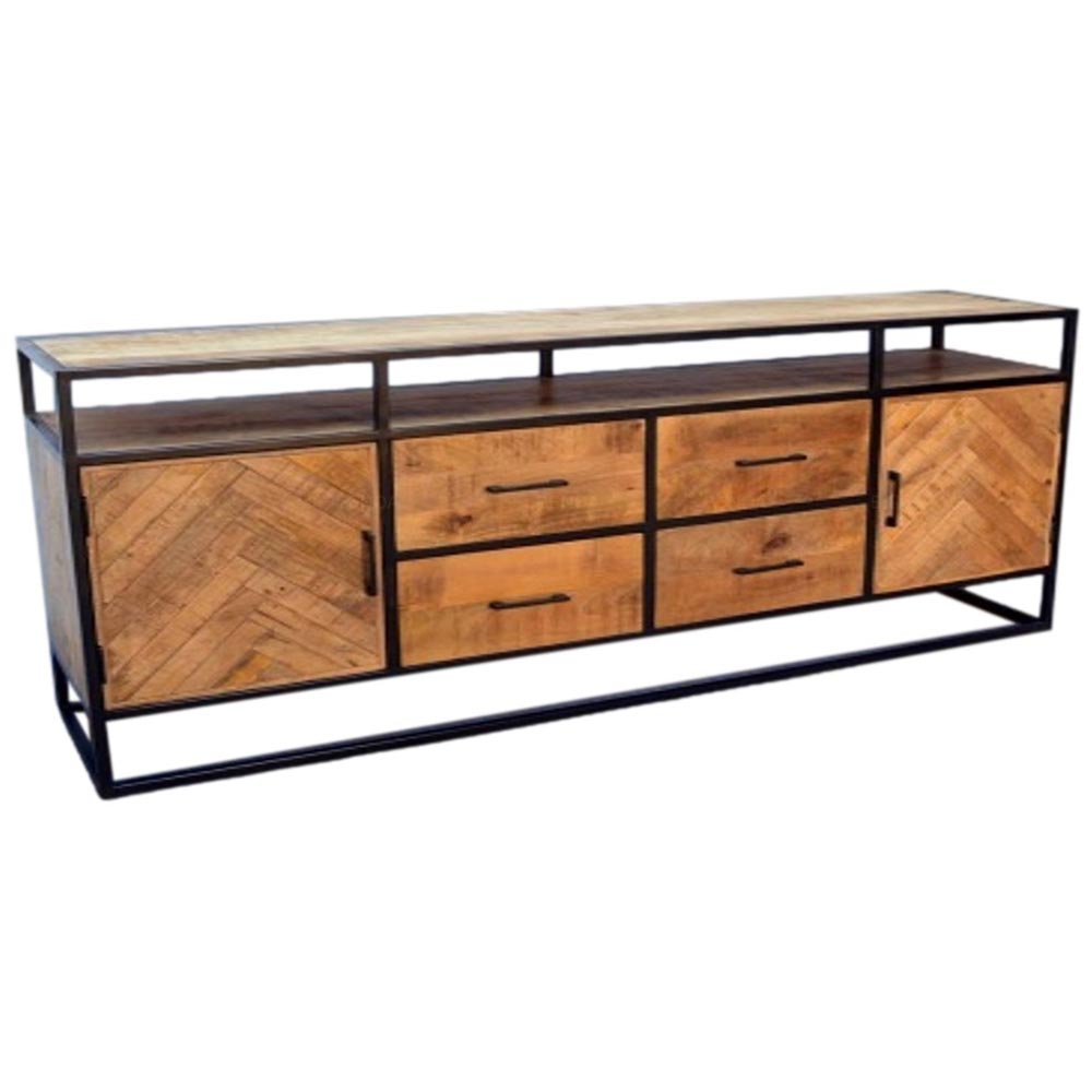 Stijlvolle tv-meubel met een houten tafelblad. Het blad en de deuren hebben een visgraad motief. Dit in combinatie met de zwart metalen poten en metalen omlijsting van de kast geeft de dressoir een stoere look. De dressoir heeft een hele luxe en moderne uitstraling.