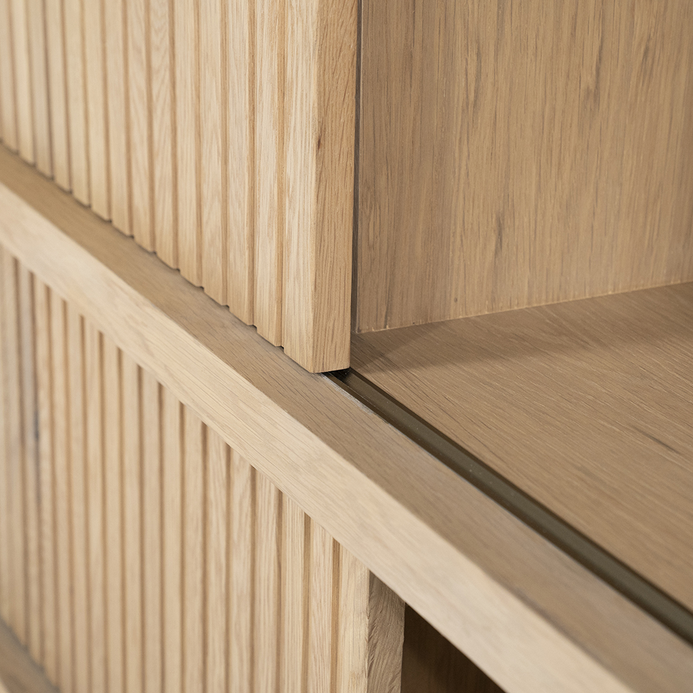 Details: – Afmetingen: 180x90x42 cm (lxhxd) – Materiaal: Eikenhout – 3 schuifdeurtjes – 8 handige vakken