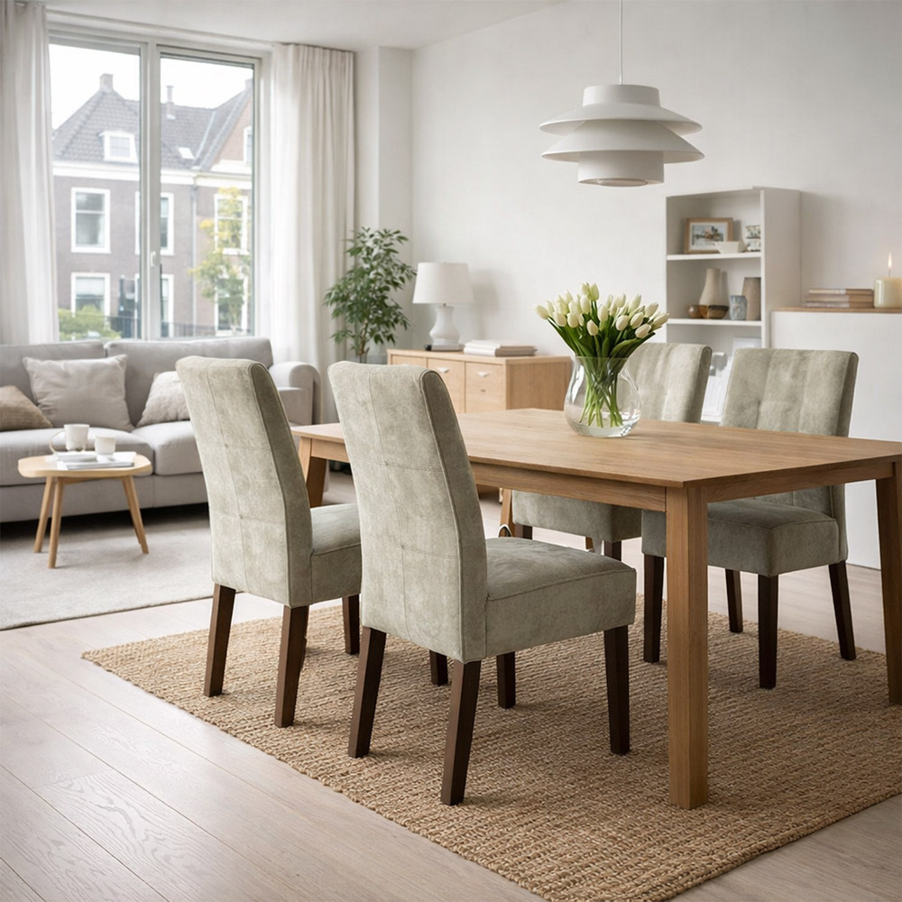 Deze groene eetkamerstoel is ideaal voor lange diners, gezellige avonden aan tafel of als comfortabele zitplek in een open woonkeuken. De combinatie van de zachte Cowboy-stof en de stevige houten basis maakt hem niet alleen aantrekkelijk om te zien, maar ook prettig in dagelijks gebruik. De kleur laat zich bovendien mooi combineren met houten eettafels, organische vormen en aardetinten in het interieur.
