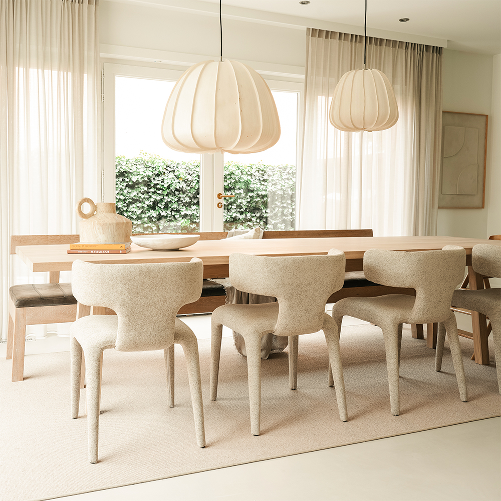 Deze opvallende eetkamerstoel combineert eigentijds design met ultiem zitcomfort. De unieke, volledig gestoffeerde constructie met zachte vormen zorgt voor een verrassend en uitnodigend uiterlijk. Dankzij de comfortabele zitting en de ergonomisch gevormde rugleuning biedt de stoel uitstekende ondersteuning en comfort tijdens lange avonden aan tafel. De stof heeft een subtiele, gemêleerde structuur in warme, natuurlijke tinten die moeiteloos in diverse interieurstijlen passen. De slanke, geïntegreerde poten geven de stoel een elegante en minimalistische uitstraling, wat zorgt voor een stijlvolle toevoeging aan iedere eethoek. Perfect voor wie houdt van modern design, hoogwaardige afwerking en buitengewoon comfort. Deze stoel is niet alleen functioneel, maar ook een echte blikvanger in huis.