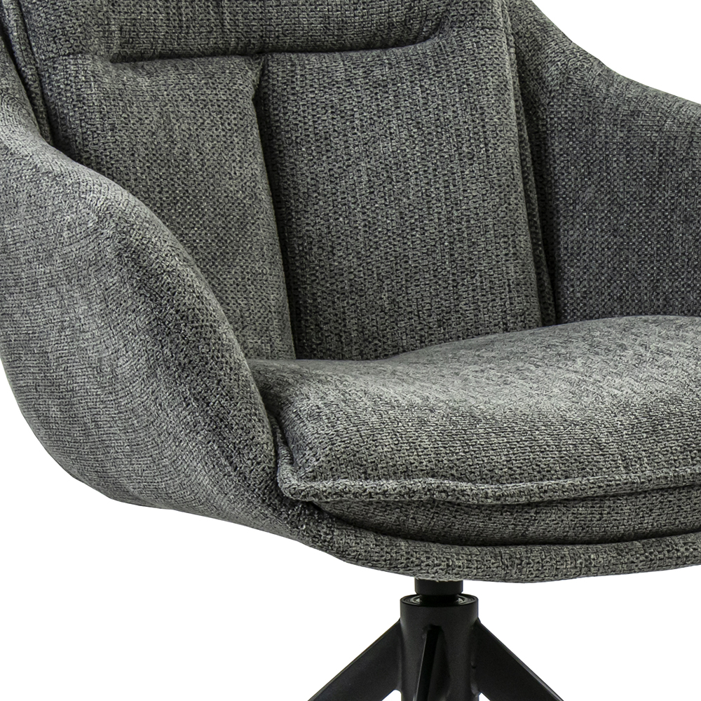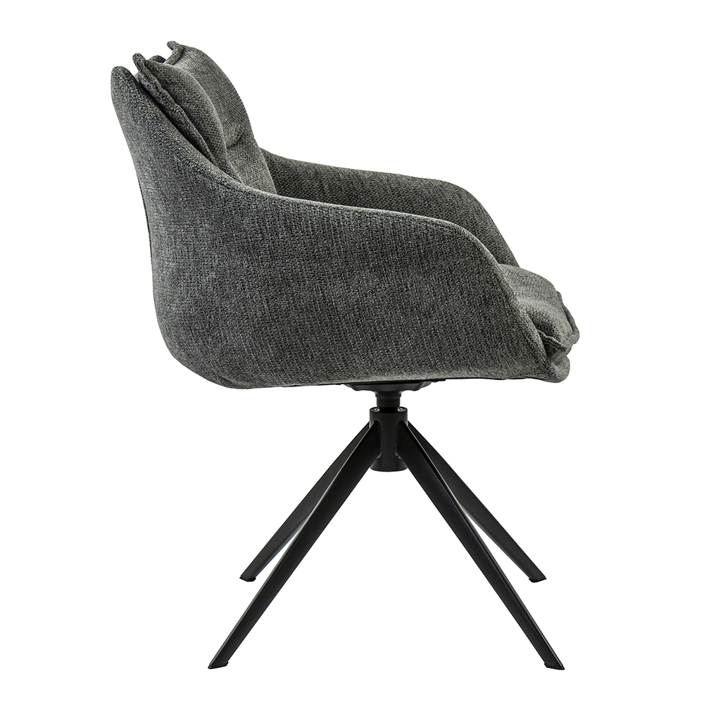 Deze comfortabele eetkamerstoel maakt dineren en gezellig borrelen een waar genot. De armstoel heeft een zachte stoffen zitting met een hoge rugleuning en armleuningen voor extra support. De stoel is draaibaar en voorzien van een return-system zodat de stoel automatisch weer terug draait. De stof heeft een grove structuur en is uitgevoerd in het grijs.