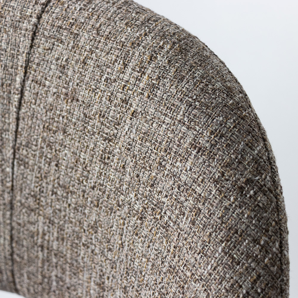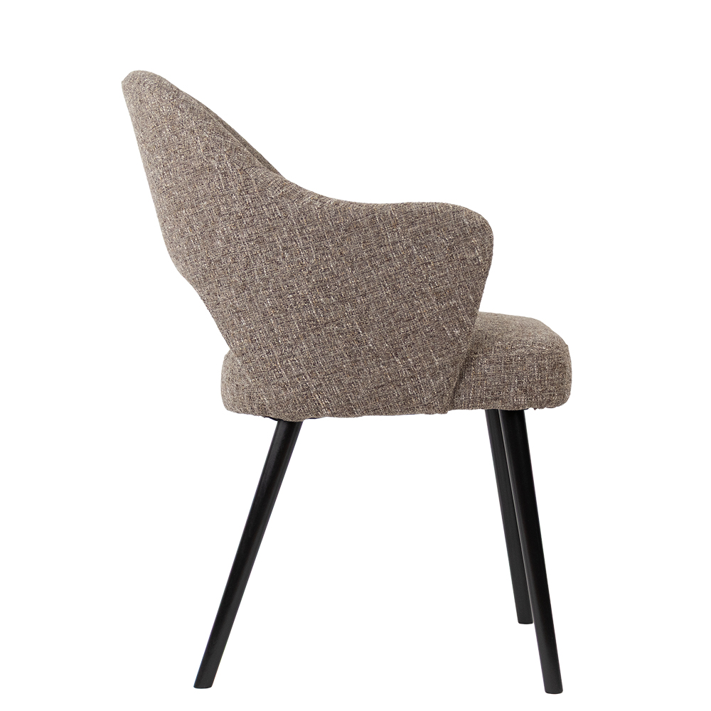 Voeg comfort en stijl toe aan je eetruimte met deze eigentijdse eetkamerstoel. De stoel is bekleed met een grof geweven stof in een warme, neutrale bruintint die gemakkelijk te combineren is met diverse interieurstijlen. De subtiele kleurvariaties in de stof geven het geheel een levendige, natuurlijke uitstraling. Dankzij de gebogen rugleuning en geïntegreerde armleuningen biedt deze stoel uitstekende ondersteuning en zitcomfort, perfect voor lange diners of gezellige avonden aan tafel. De zwarte metalen poten zorgen voor een modern contrast en bieden een stabiele basis.