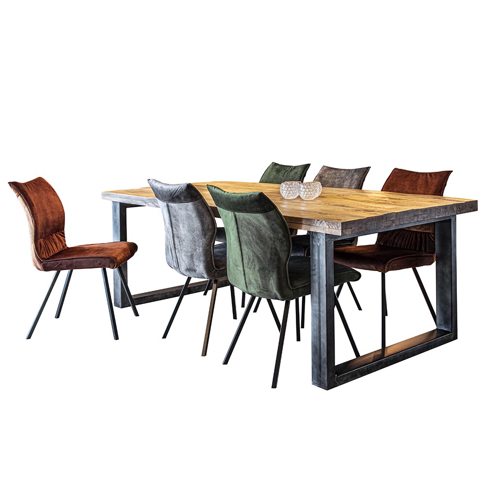 Een trendy stoeltje met een landelijke uitstraling. De eetkamerstoel heeft een zitting die doorloopt in de rug en volledig is voorzien van een velourse stof. Dit geeft een luxe look en feel aan het stoeltje. De pootjes zijn van metaal en voorzien van een zwarte finish. Leuk met zes rond een tafel en te combineren in diverse kleuren.