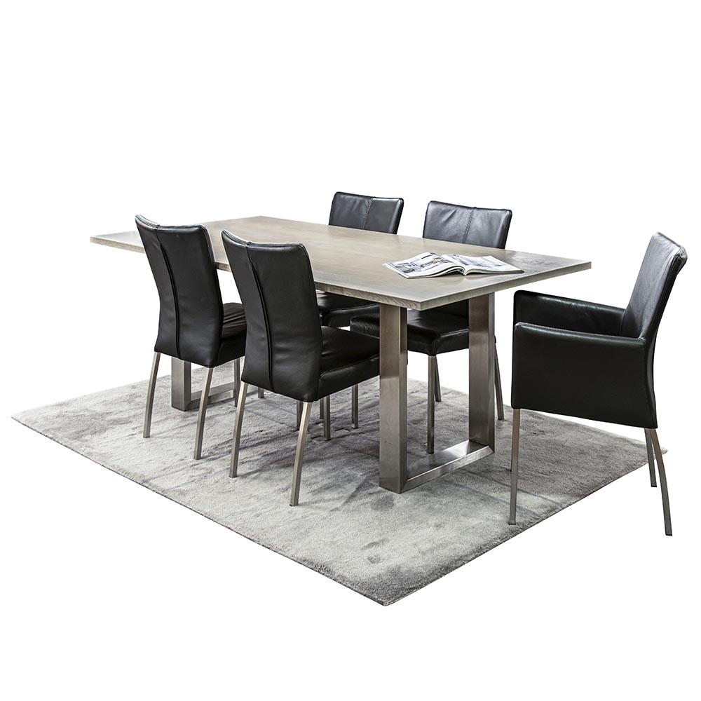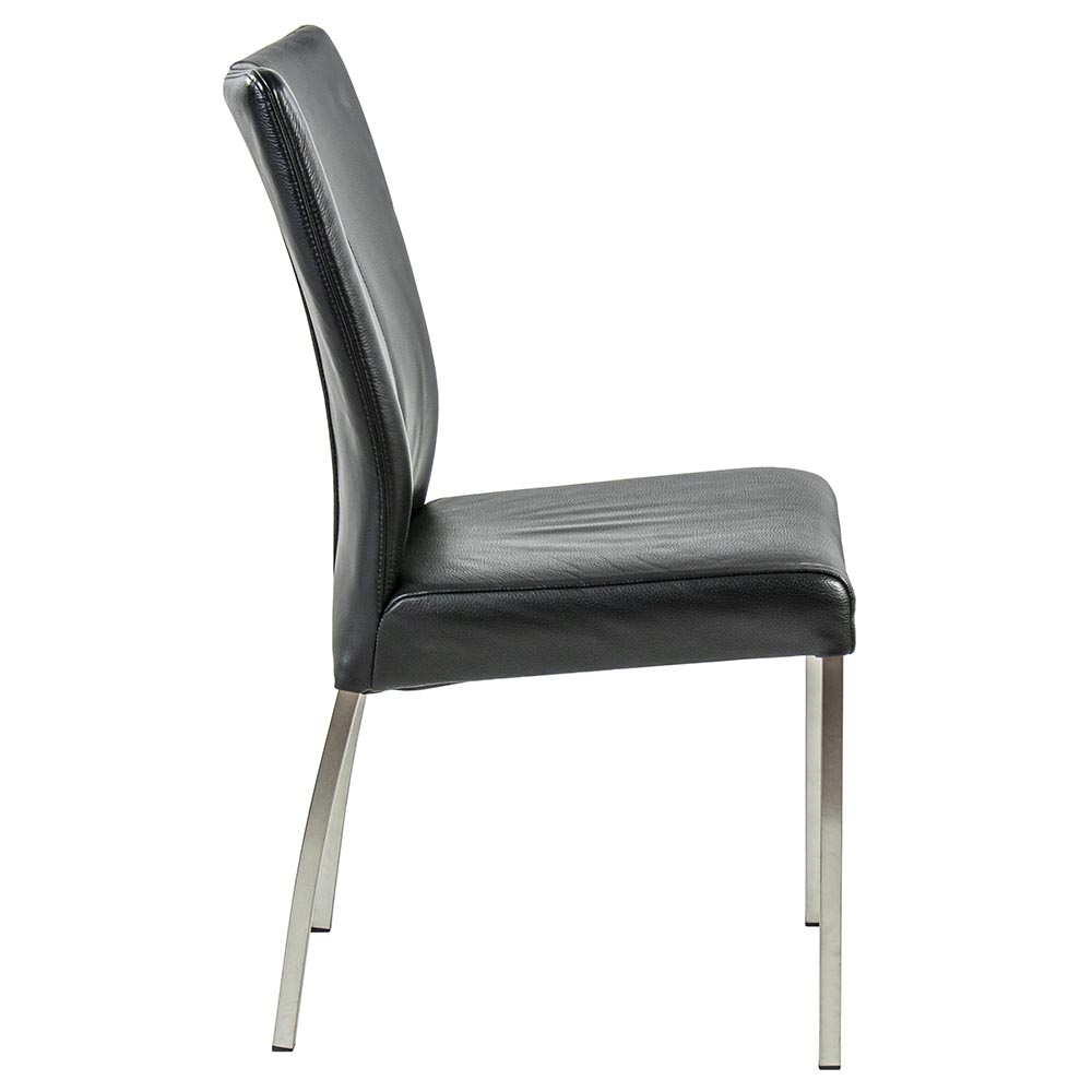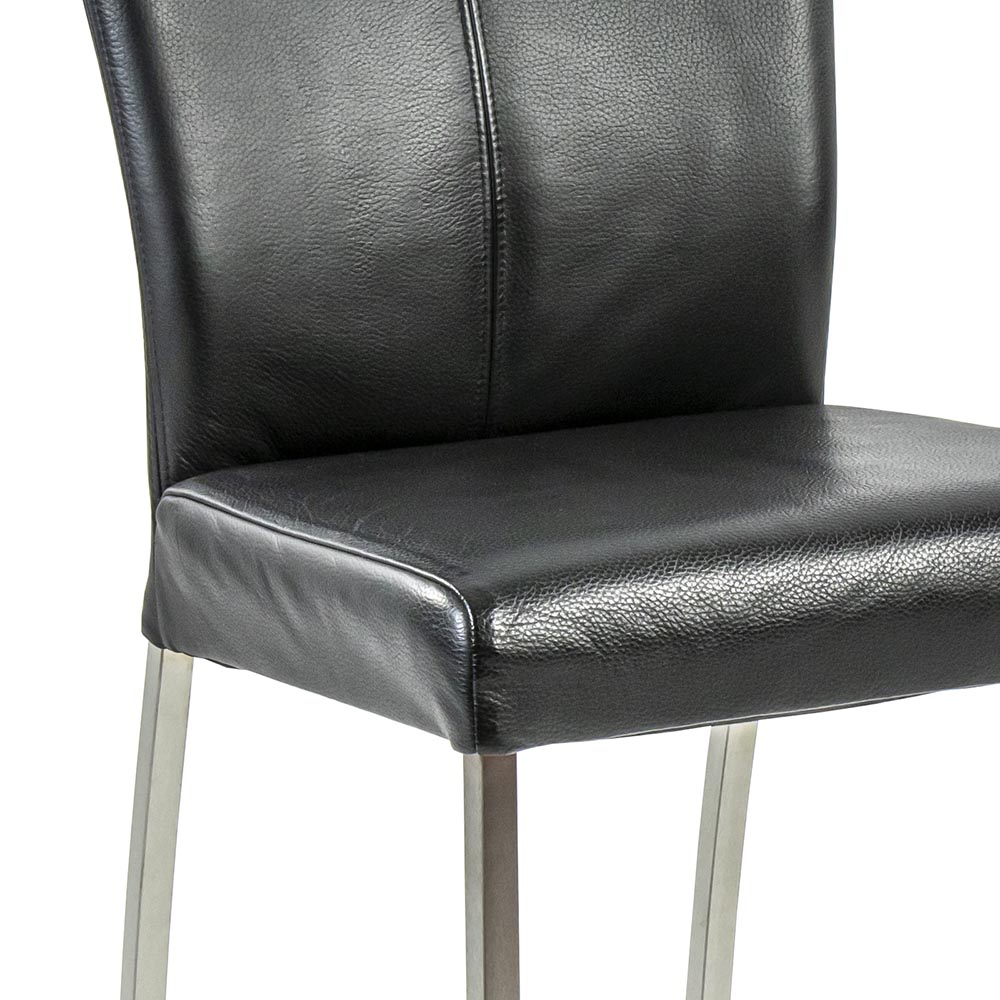 Deze moderne eetkamerstoel is uitgevoerd met een lederen zitting in het zwart. Dit geeft de stoel een luxe moderne uitstraling die mooi matcht bij de slanke RVS poten. Het leder is mooi afgewerkt en gestikt in dezelfde kleur als de zitting zelf. De rugleuning van de eetkamerstoel is wat hoger wat een extra zitcomfort geeft.