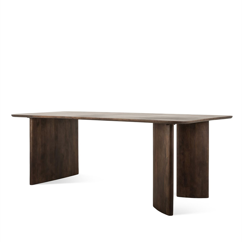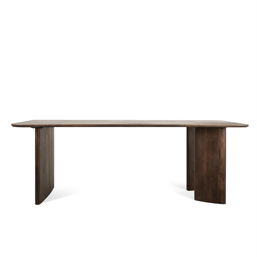 Deze eettafel combineert een rechthoekig blad met afgeronde hoeken en een speels asymmetrisch onderstel, wat zorgt voor een organisch en dynamisch design. Gemaakt van walnootkleurig mangohout, past deze tafel perfect binnen de botanische, Scandinavische of Japandi woonstijl, waar eenvoud en warmte centraal staan.