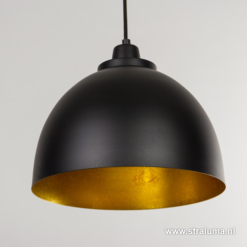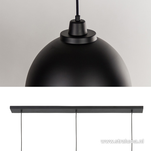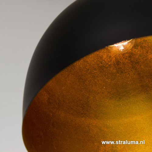 Uitstekende hanglamp voor boven een bar of eettafel. De lange balk met de drie kappen geven nog meer sfeer en lengte aan de bar of eettafel. De eettafelhanglamp is uitgevoerd in mat zwart met een gouden binnenkant, helemaal van deze tijd. Door het snoer kunt u deze hanglamp eenvoudig inkorten.