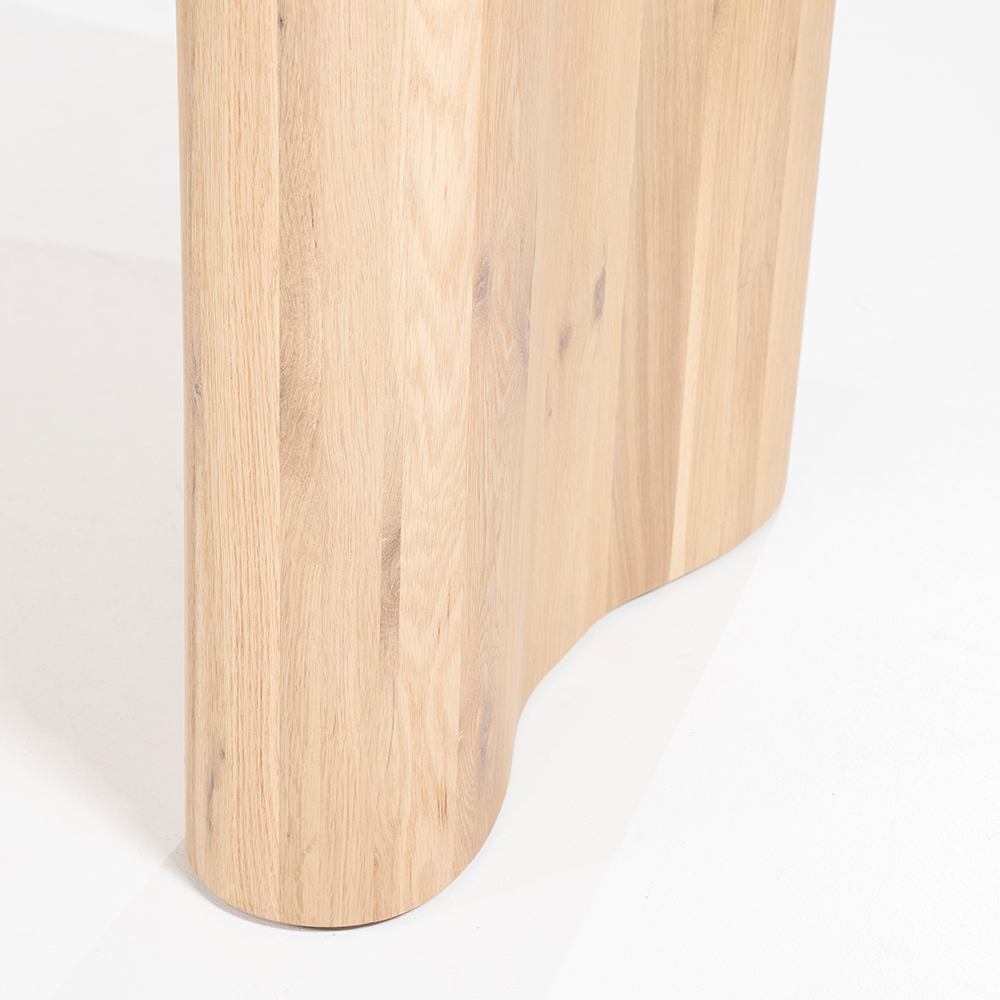 Deze prachtige tafel valt direct op dankzij zijn unieke organische vorm en robuuste uitstraling. Gemaakt van hoogwaardig massief eikenhout, heeft de tafel een natuurlijk en warm karakter dat wordt benadrukt door de fraaie nervenstructuur en lichte kleurnuances van het hout. De bijzondere afgeronde vormen van het tafelblad zorgen ervoor dat de tafel in elke ruimte direct de aandacht trekt en tegelijkertijd zacht en uitnodigend oogt. De stevige, golvende poten versterken het natuurlijke karakter en geven de tafel een eigentijds en stijlvol uiterlijk. Dankzij de ruime afmetingen biedt deze tafel genoeg plaats om gezellig te tafelen, uitgebreid te borrelen of comfortabel te werken. Een tijdloos designstuk dat jouw interieur moeiteloos verrijkt met een vleugje natuurlijke elegantie.