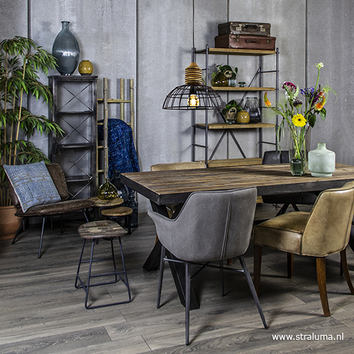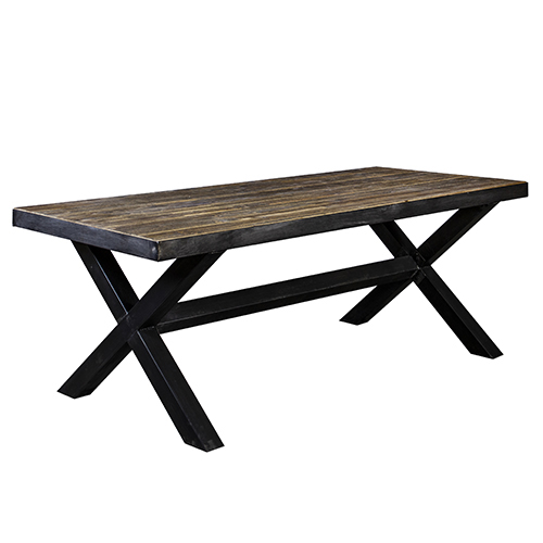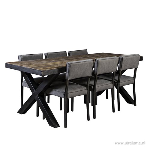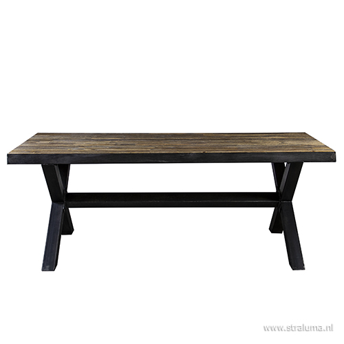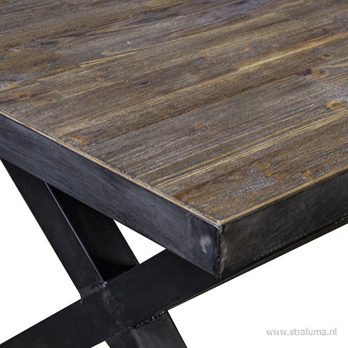 Deze stoere eettafel ziet eruit alsof hij al een heel leven achter de rug heeft. Dat prachtige doorleefde uiterlijk heeft deze tafel te danken aan het pure hout met de sterk aanwezige nerf structuur. Ook het stoere onderstel draagt bij aan de industriële look van deze trendy eettafel. De stalen X-poten, in zink-look, zijn gemaakt van vierkante buizen van 8 x 8 cm en zijn met elkaar verbonden door een dwarsstang (ook 8 x 8 cm). Het blad rust in een metalen frame, hierdoor is het blad 7 cm dik.