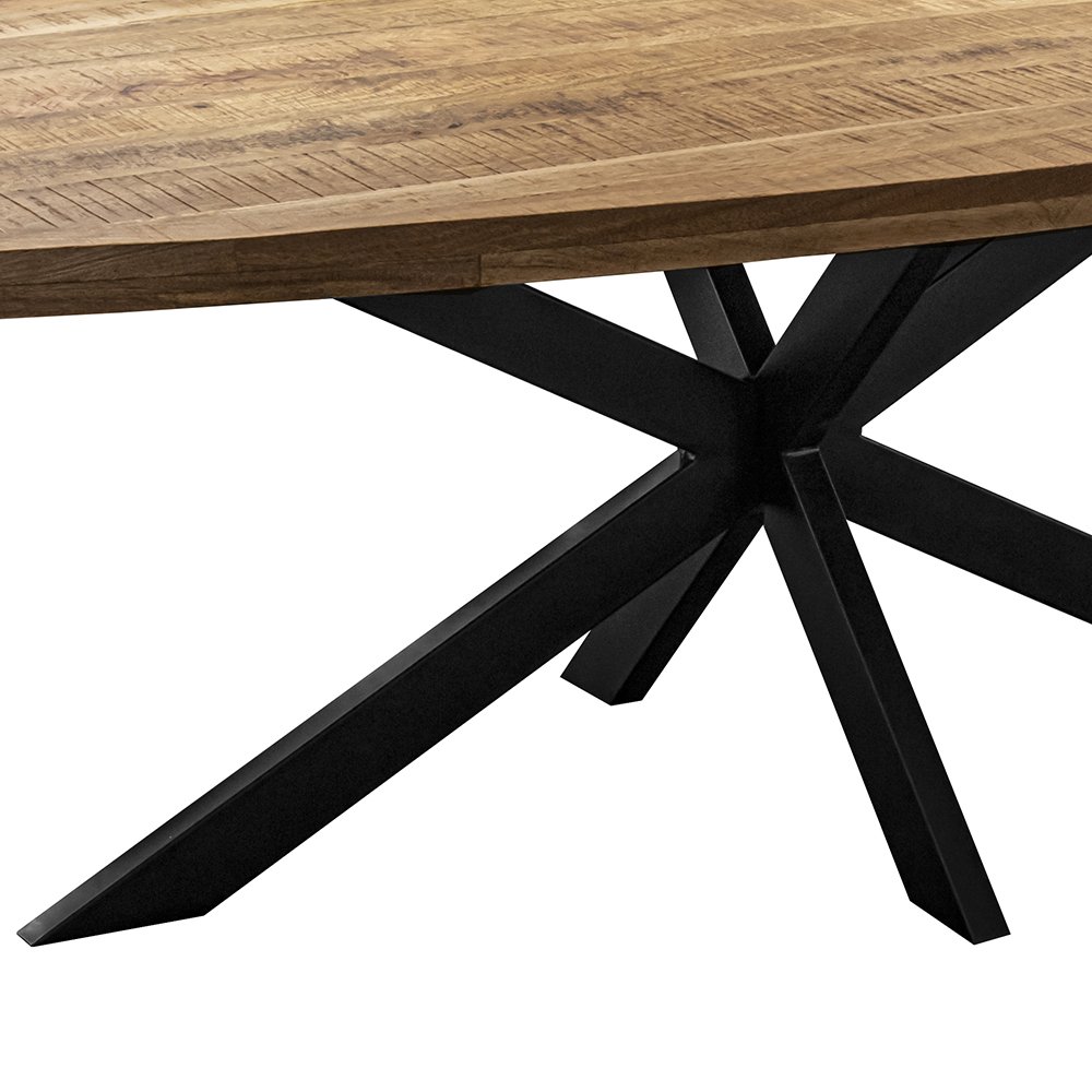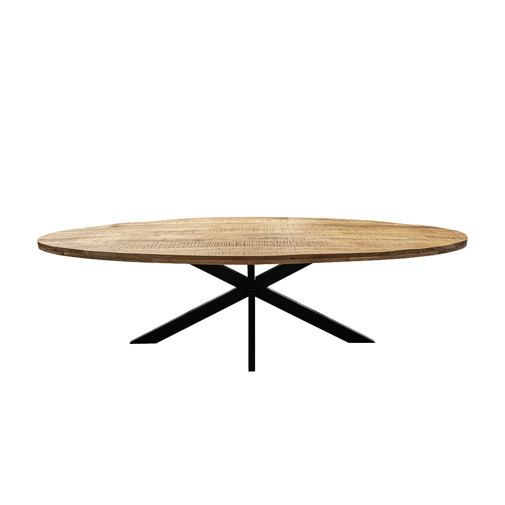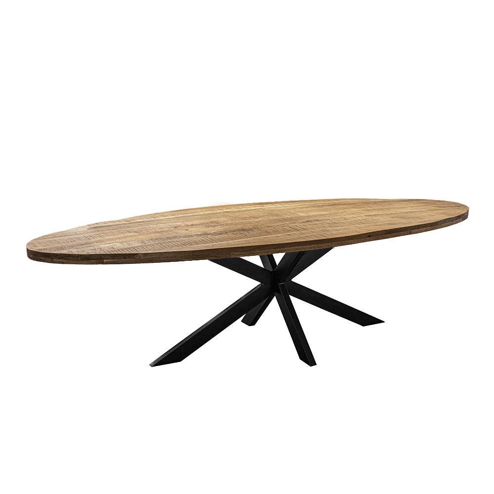 Deze prachtige eettafel bestaande uit een stevig tafelblad van mangohout en een spinpoot van metaal die samen zorgen voor een prachtig samenspel waardoor de tafel een waar kunstwerk wordt om naar te kijken. Het elegante ontwerp combineert strakke lijnen met een subtiele diagonale accenten. De organische vorm zorgt voor een harmonieuze uitstraling en creëert een gezellige sfeer in de woonkamer terwijl de zwarte gepoedercoate spinpoot de tafel een trendy en industriële touch geeft.