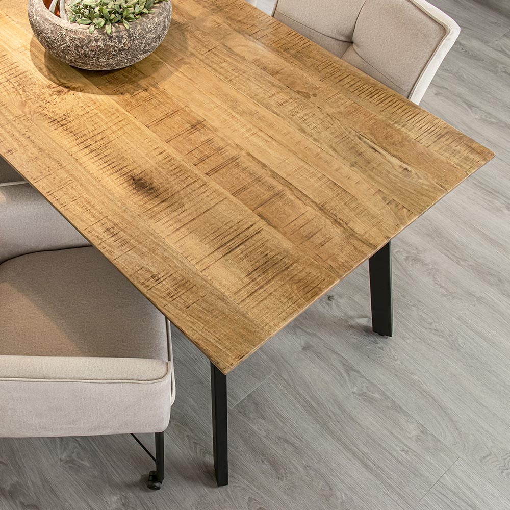 Deze rechthoekige eettafel biedt genoeg ruimte voor 6 tot 8 personen. De tafel is voorzien van een mango houten blad met een afmeting van 240×90 cm. De dikte van het blad is 3 cm. Het blad wordt ondersteund door slanke zwart metalen poten die de tafel luchtig en open houden. De combinatie van het mangohout en het zwart maakt de tafel prima geschikt voor diverse woonstijlen als landelijk of industrieel.
