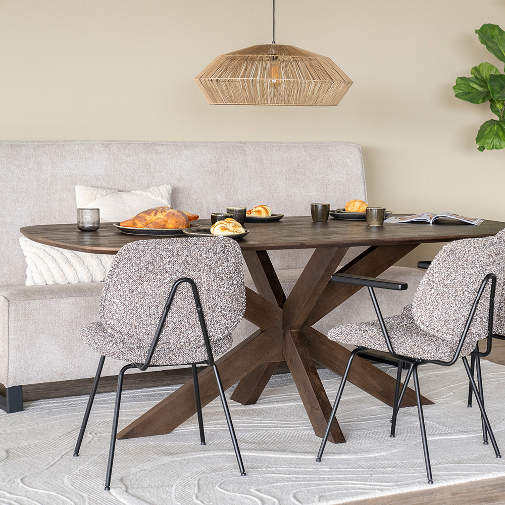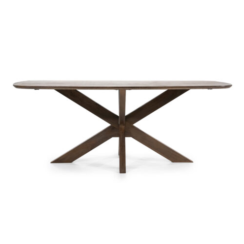 Stijlvolle eettafel Nikki in een mooie diep bruine kleur. Het tafelblad heeft een afmeting van 200x100cm en wordt ondersteund door 4 rechthoekige poten die in een gekruiste formatie onder het blad staan. Dit creëert een interessant beeld wat mooi te combineren in een botanische of oosterse woonstijl.