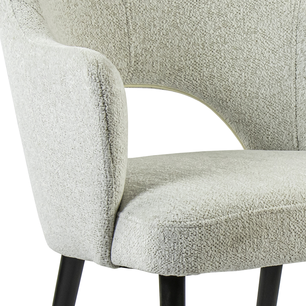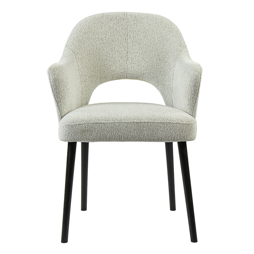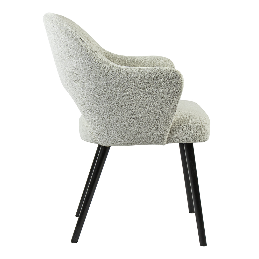 Een fijne eetkamerstoel om heerlijk op te dineren of gezellig te borrelen. De stoel heeft een stoffen zitting die wordt ondersteund door houten poten. Deze zijn zwart gelakt en geven zo een moderne look aan de stoel. De zitting is volledig van stof en uitgevoerd in het licht grijs. De armleuningen bieden extra comfort zodat ook natafelen geen probleem is op deze stoel.