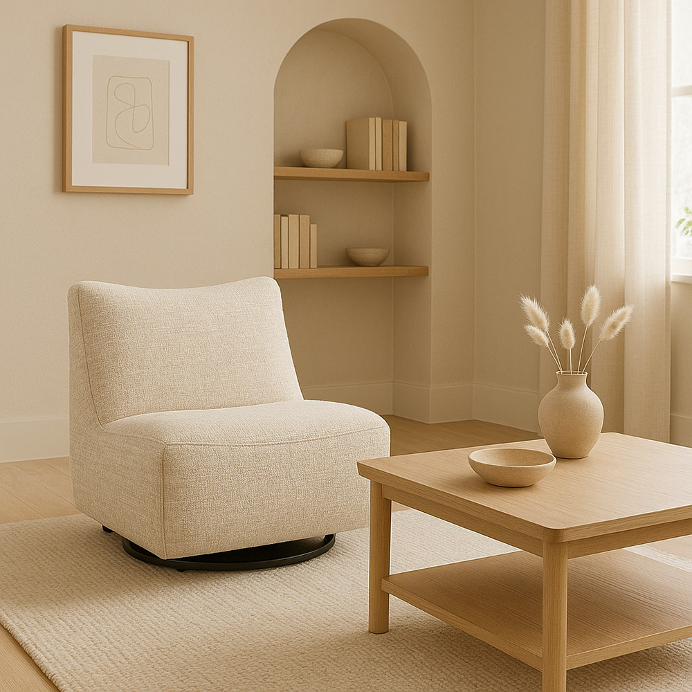 Deze fauteuil straalt comfort en stijl uit door het uitnodigende ontwerp en de zachte bekleding in een verfijnde beigekleur. Dankzij de draaibare voet biedt de stoel extra functionaliteit, waardoor je gemakkelijk naar iedere richting draait. De hoogwaardige stof heeft een fraaie textuur met subtiele reliëfdetails die zorgen voor een luxe uitstraling en een warme sfeer. Door zijn moderne, minimalistische vormgeving past deze fauteuil uitstekend in diverse interieurs, van hedendaags tot Scandinavisch of klassiek. Perfect om heerlijk te ontspannen, een boek te lezen of rustig te genieten van een moment voor jezelf
