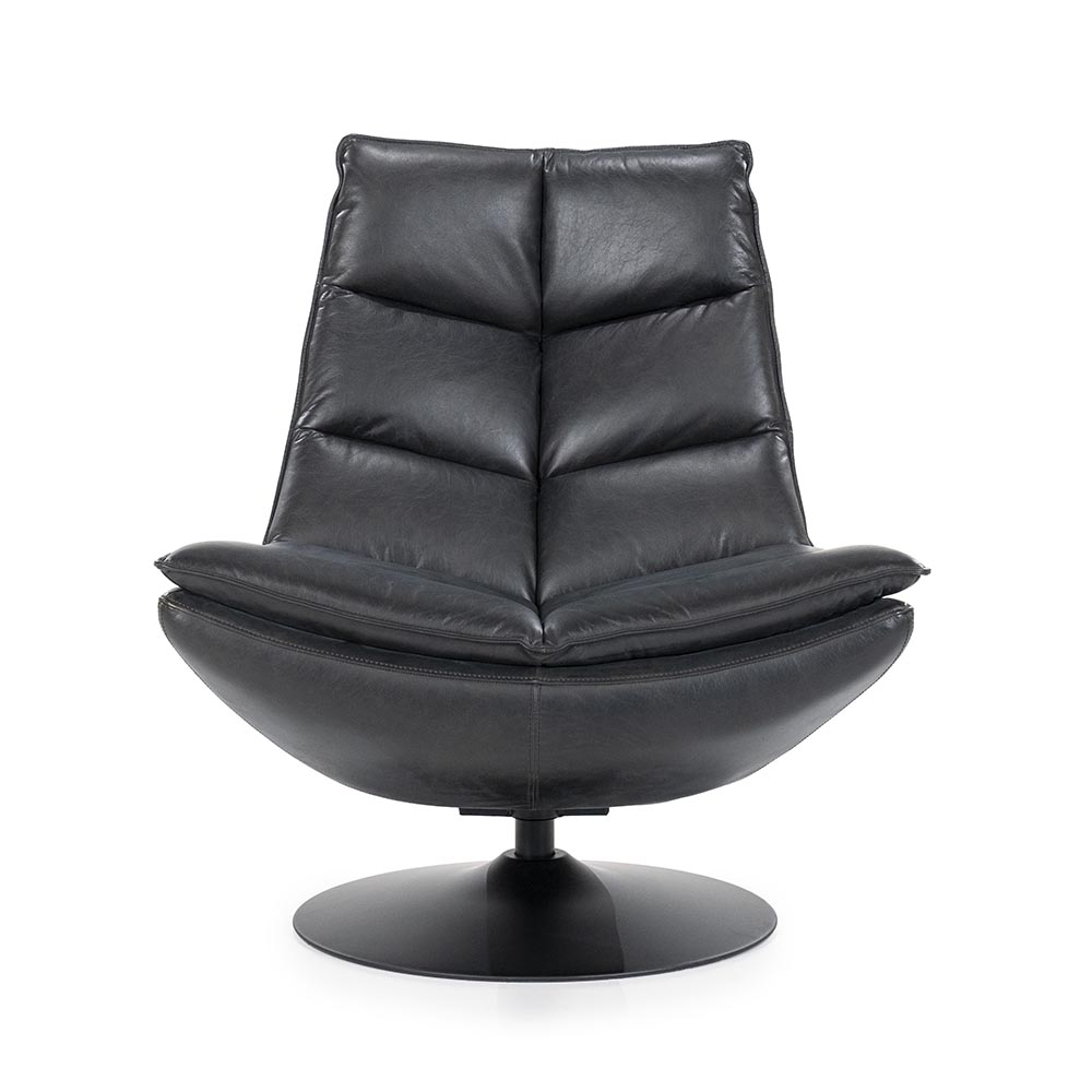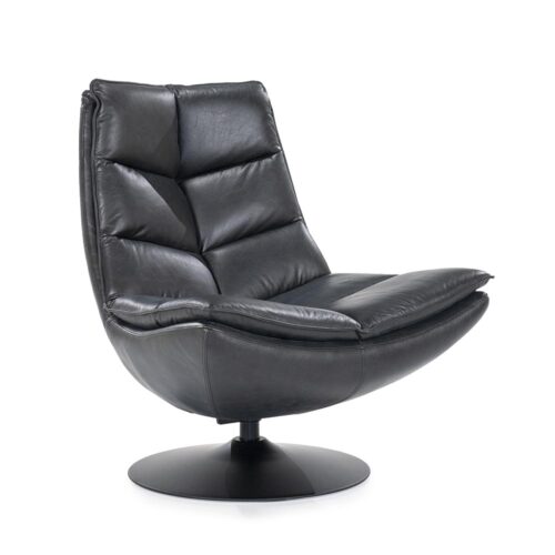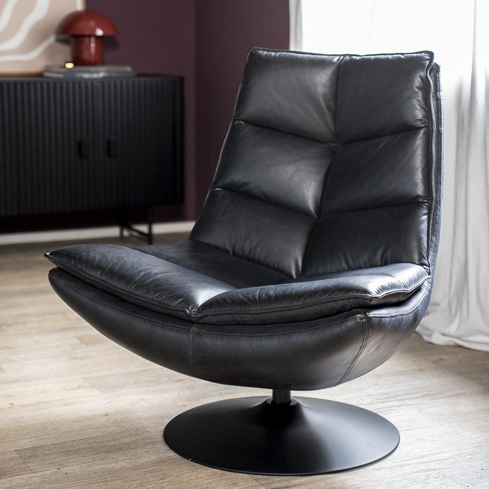 Luxe fauteuil in een elegant en tijdloos design. Dankzij de ronde vormen en het zachte leer is deze stoel heel comfortabel. De stoel is van echt rundleer. Hij staat op een zwarte ronde metalen draaivoet. Deze fauteuil is beschikbaar in 3 kleuren.