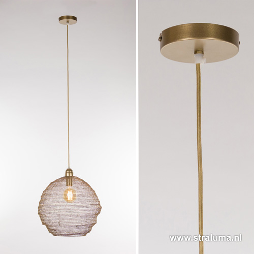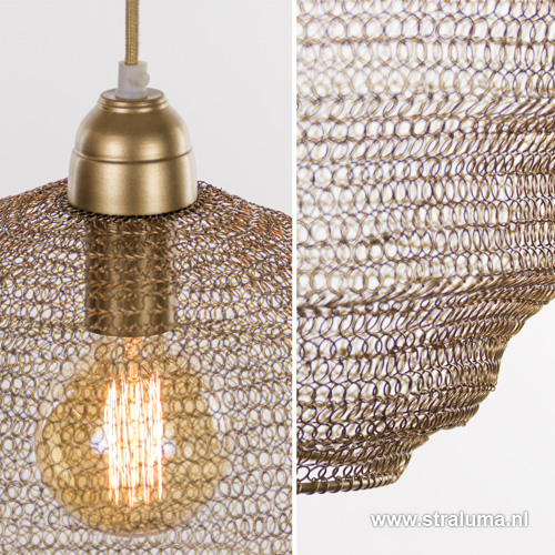Een juweeltje, deze gaas hanglamp Nina. Prachtig in een hal, slaapkamer of ‘gewoon’ boven de eettafel. De lamp is gemaakt van gaas dat wel wat doet denken aan een maliënkolder. Erg mooi wanneer de gazen hanglamp uit is, maar prachtig wanneer deze aan staat. Een hanglamp als deze past prachtig in een romantisch, of landelijk interieur. Het metaal is in een mat gouden kleur gespoten, heeft ook heel veel weg van een bronzen kleur.