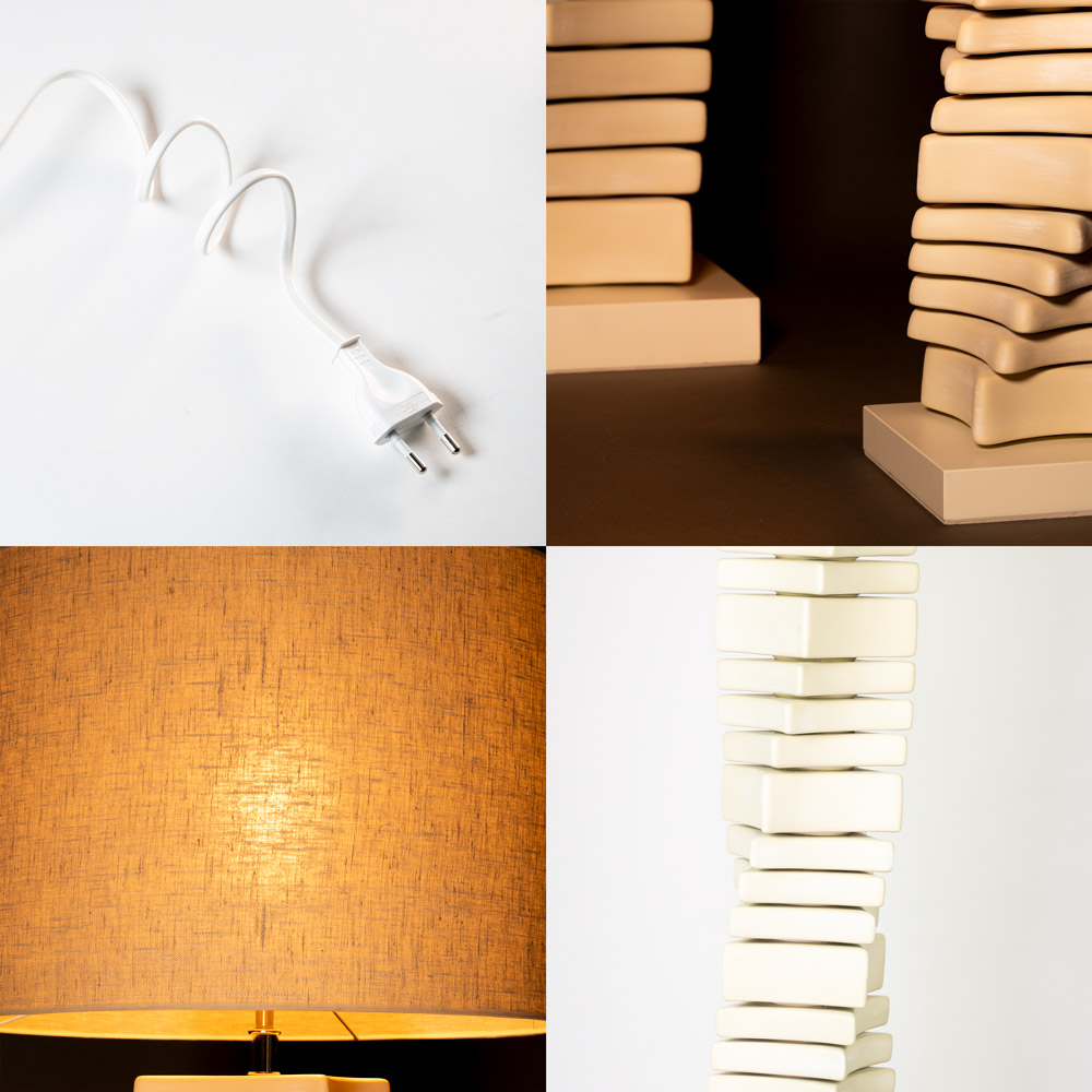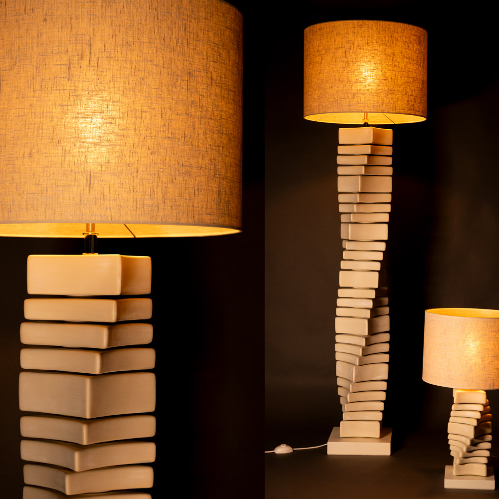 Deze keramische vloerlamp is een stijlvolle blikvanger in de woonkamer, leeshoek of naast een fauteuil. De hoge voet bestaat uit gestapelde, licht gedraaide keramische elementen die samen een sculpturaal en verfijnd geheel vormen. Dankzij de kantelbare kop richt je het licht eenvoudig naar wens, terwijl de royale stoffen kap zorgt voor een zachte en gelijkmatige lichtverdeling.