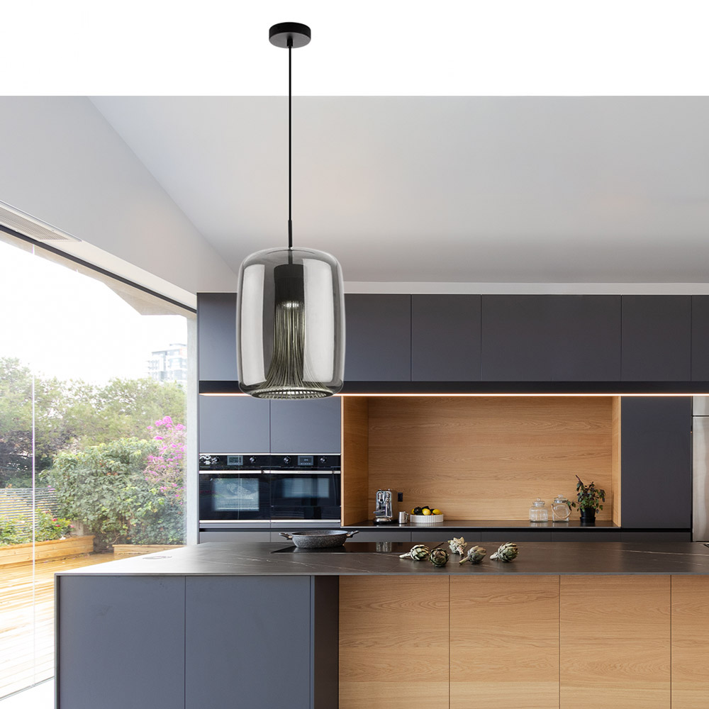 • Producttype: Hanglamp • Kleur: Zwart chroom glas • Afmetingen kap: H 38 × Ø 24 cm • Totale lamp: H max. 180 cm × Ø 24 cm • Plafondbevestiging: H 2,3 × Ø 9,3 cm • Materiaal: Glas / metaal • Fitting: GU10 • Max. wattage: 12 watt • Lichtbron: Exclusief • Dimbaar: Ja, via externe schakelaar en geschikte lichtbron (niet inbegrepen)