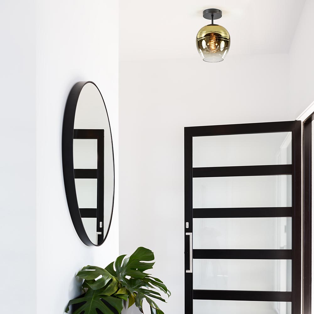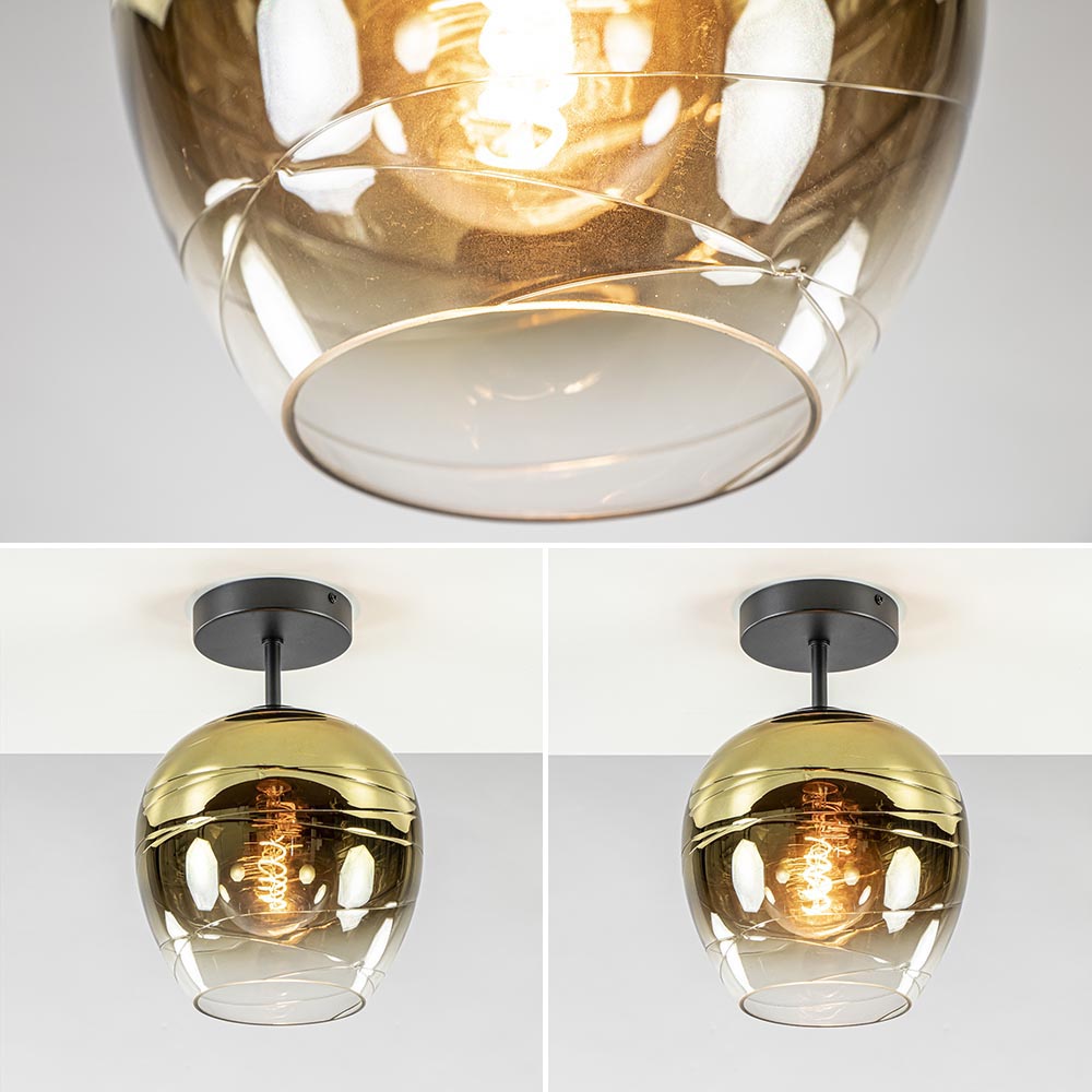 Een luxe plafondlamp, prima geschikt voor een hal, slaapkamer of zelfs het toilet. Deze plafondlamp is voorzien van bijzonder glas met een mooi effect. De glazen kap is afgewerkt met een gold gradient, een verloop in het glas van goud naar helder. Dit geeft de lamp een luxe chique uitstraling en maakt hem echt uniek. De glazen kap wordt bevestigd op een mat zwarte plafondbevestiging. De stijlvolle plafondlamp zwart met goud is dimbaar middels een externe dimmer (exclusief) en wordt geleverd zonder lichtbron (E27).