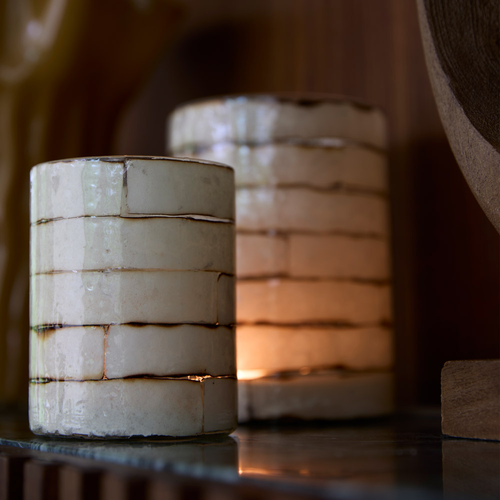 Een sfeervolle glazen theelichthouder met gekleurd glasdetail die zorgt voor een warm en zacht lichtspel. Het transparante glas wordt gecombineerd met subtiele stukken glas in crème of mintgroen, waardoor het kaarslicht prachtig wordt verspreid en een rustige, decoratieve uitstraling ontstaat. Perfect als theelichthouder op een salontafel, dressoir, eettafel of in een open kast.