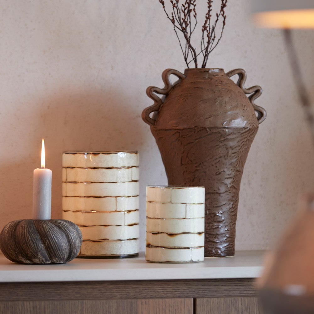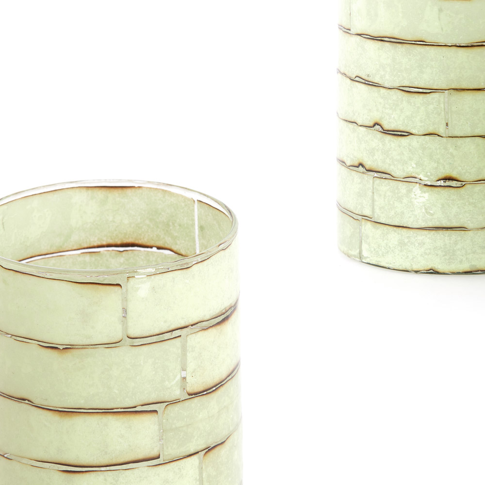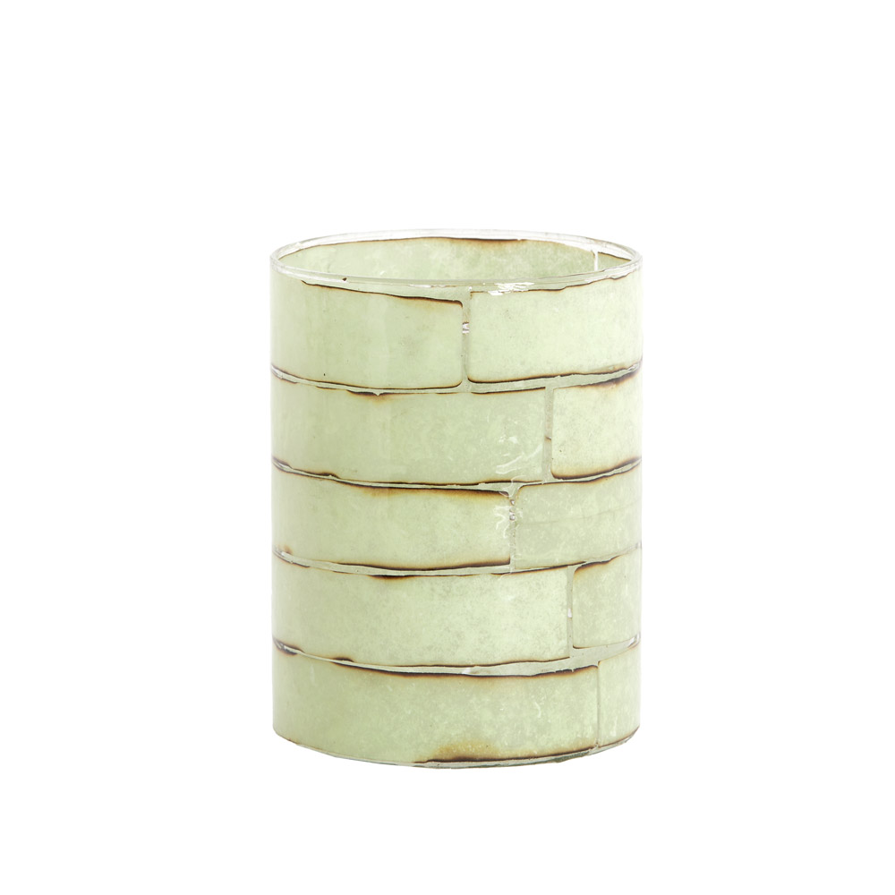 Een sfeervolle glazen theelichthouder met gekleurd glasdetail die zorgt voor een warm en zacht lichtspel. Het transparante glas wordt gecombineerd met subtiele stukken glas in crème of mintgroen, waardoor het kaarslicht prachtig wordt verspreid en een rustige, decoratieve uitstraling ontstaat. Perfect als theelichthouder op een salontafel, dressoir, eettafel of in een open kast.