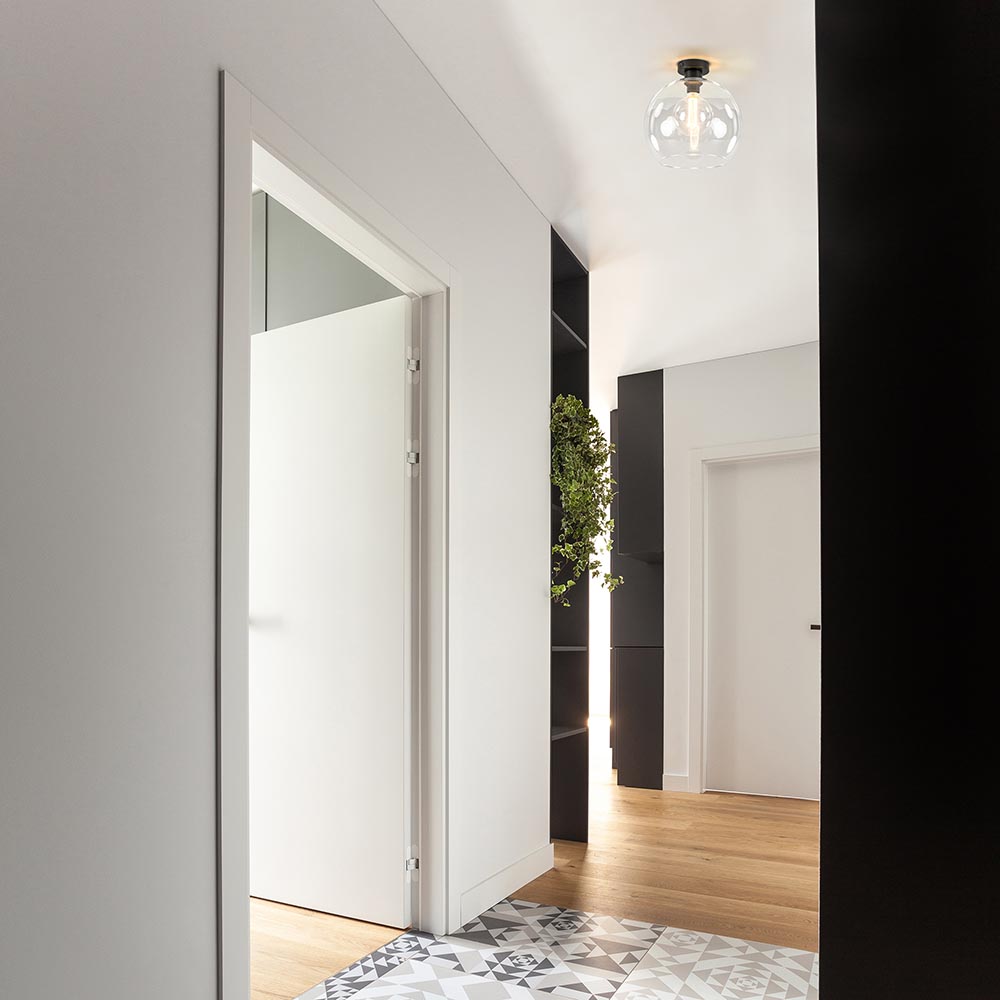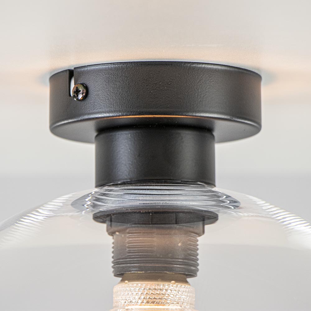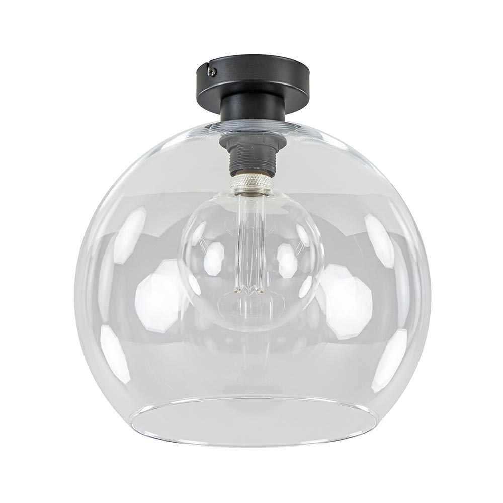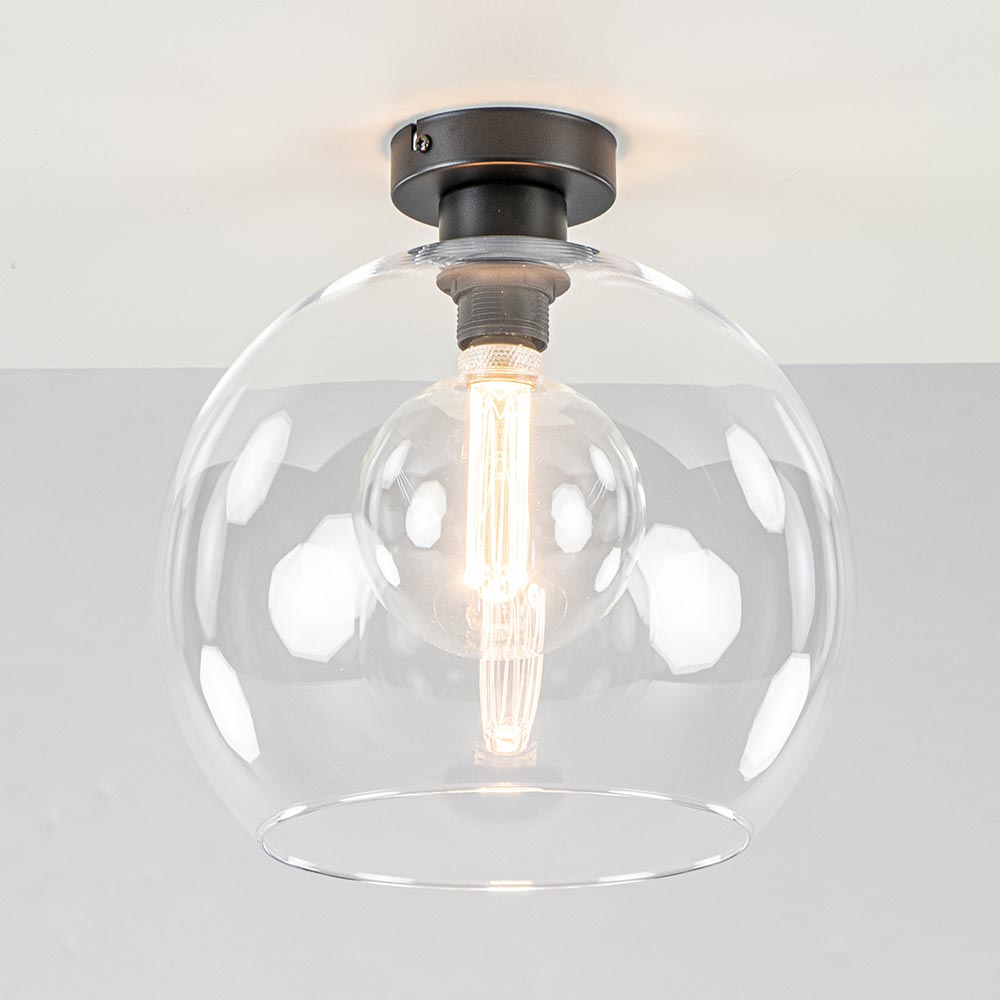 Glazen lampen zijn helemaal trendy, en in vele soorten en maten verkrijgbaar. Deze helder glazen bol van 30 cm doorsnede is een ideale plafondlamp omdat deze in vrijwel alle soorten woonstijlen en ruimtes past. De glazen kap zit vast aan de mat zwart metalen plafondbevestiging. Door het glas bepaald de lichtbron wel de sfeer, kies dan ook de juiste voor de gewenste sfeer.