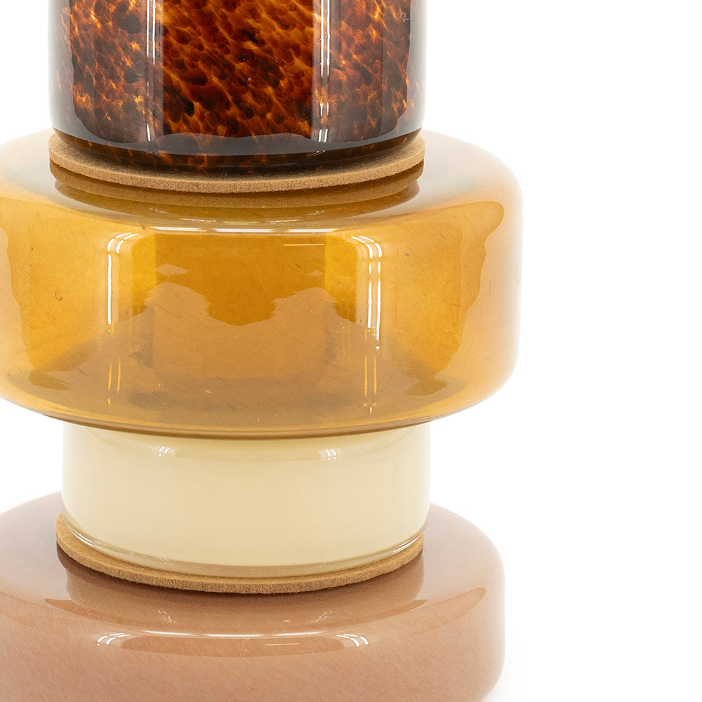Specificaties: ⠀⠀⠀⠀• Afmetingen: 17 x 29 x 32 cm (lxbxh, totale stapeling) ⠀⠀⠀⠀• Kleur: Diverse bruintinten, met gespikkeld accent ⠀⠀⠀⠀• Materiaal: Mondgeblazen glas ⠀⠀⠀⠀• Vorm: Stapelbaar object, modulair opgebouwd ⠀⠀⠀⠀• Gebruik: Decoratief – niet geschikt als vaas of voor gebruik met water