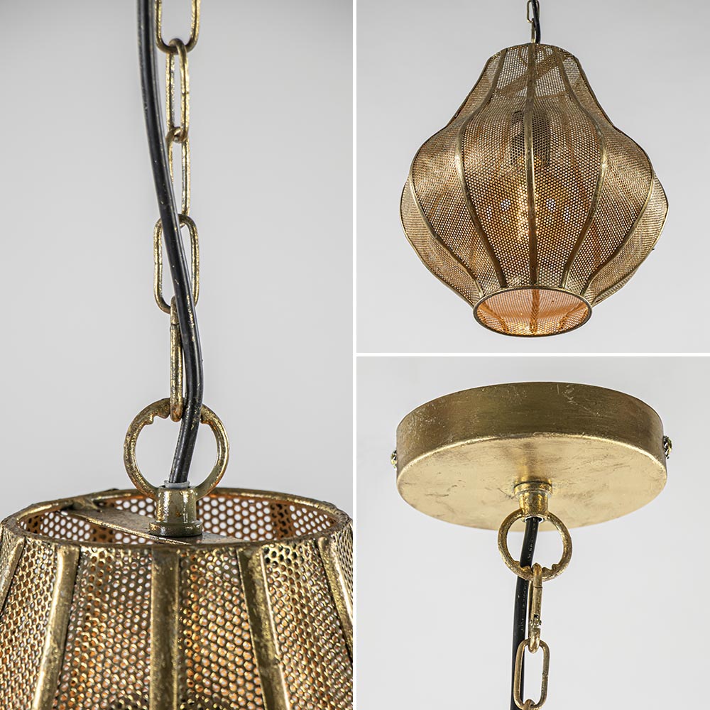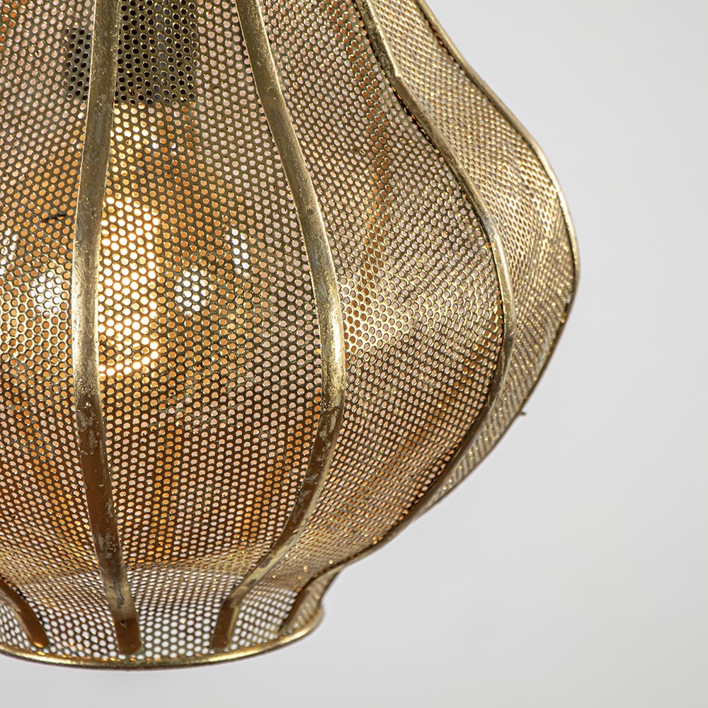 Deze tulp-vorm hanglamp is gemaakt van geperforeerde platen, het geheel is afgewerkt met platte ribben. Plafondbevestiging, ketting en lamp zijn afgewerkt in goud met een antiek-look. Het goud heeft een mooie glans waardoor deze oosterse hanglamp extra opvalt. Deze lamp is, door de ketting en de carabiners, eenvoudig in hoogte verstelbaar. Prachtig in de slaapkamer, boven de salontafel, in de keuken of boven de eettafel.