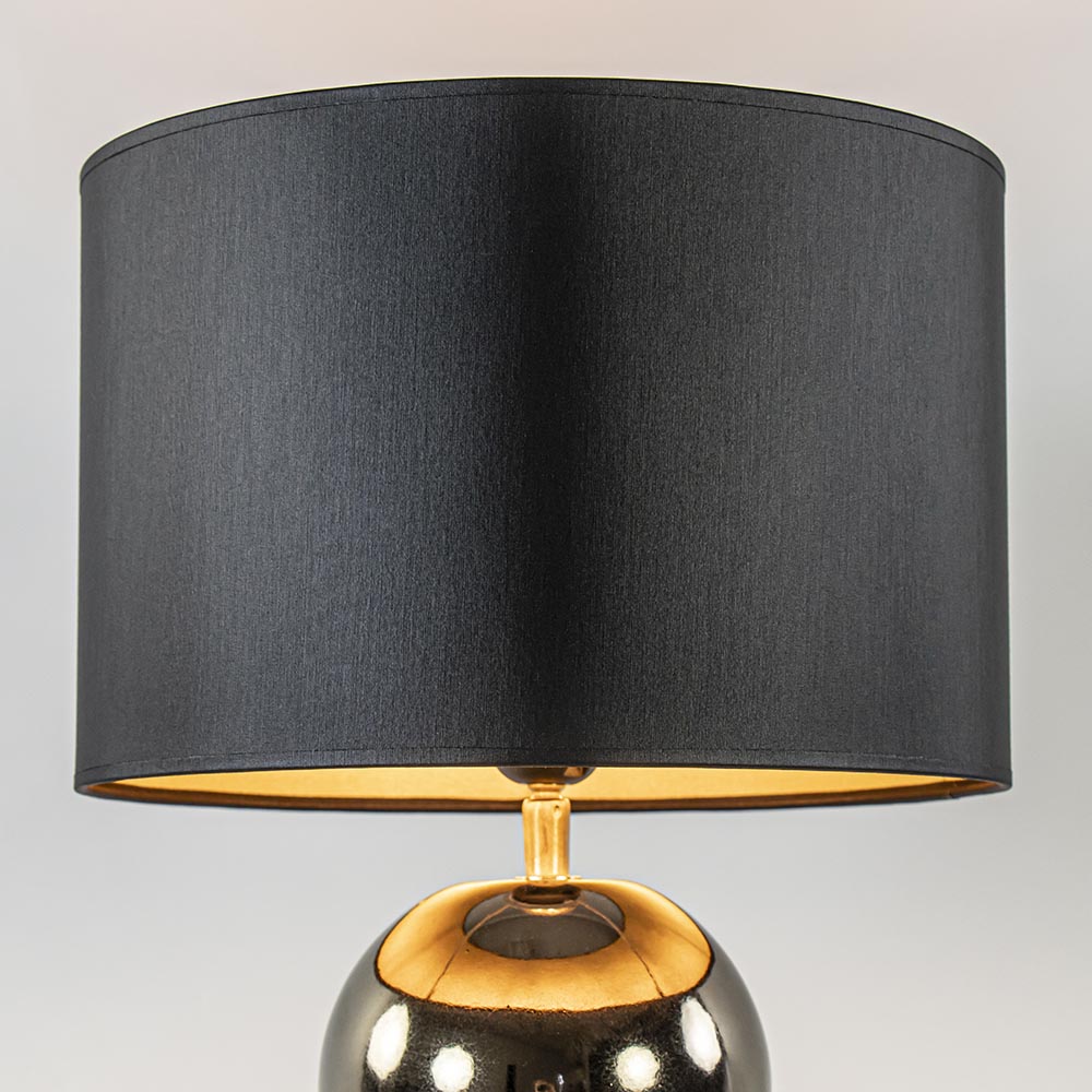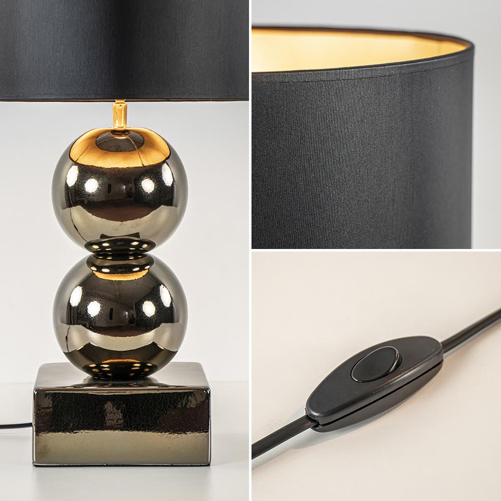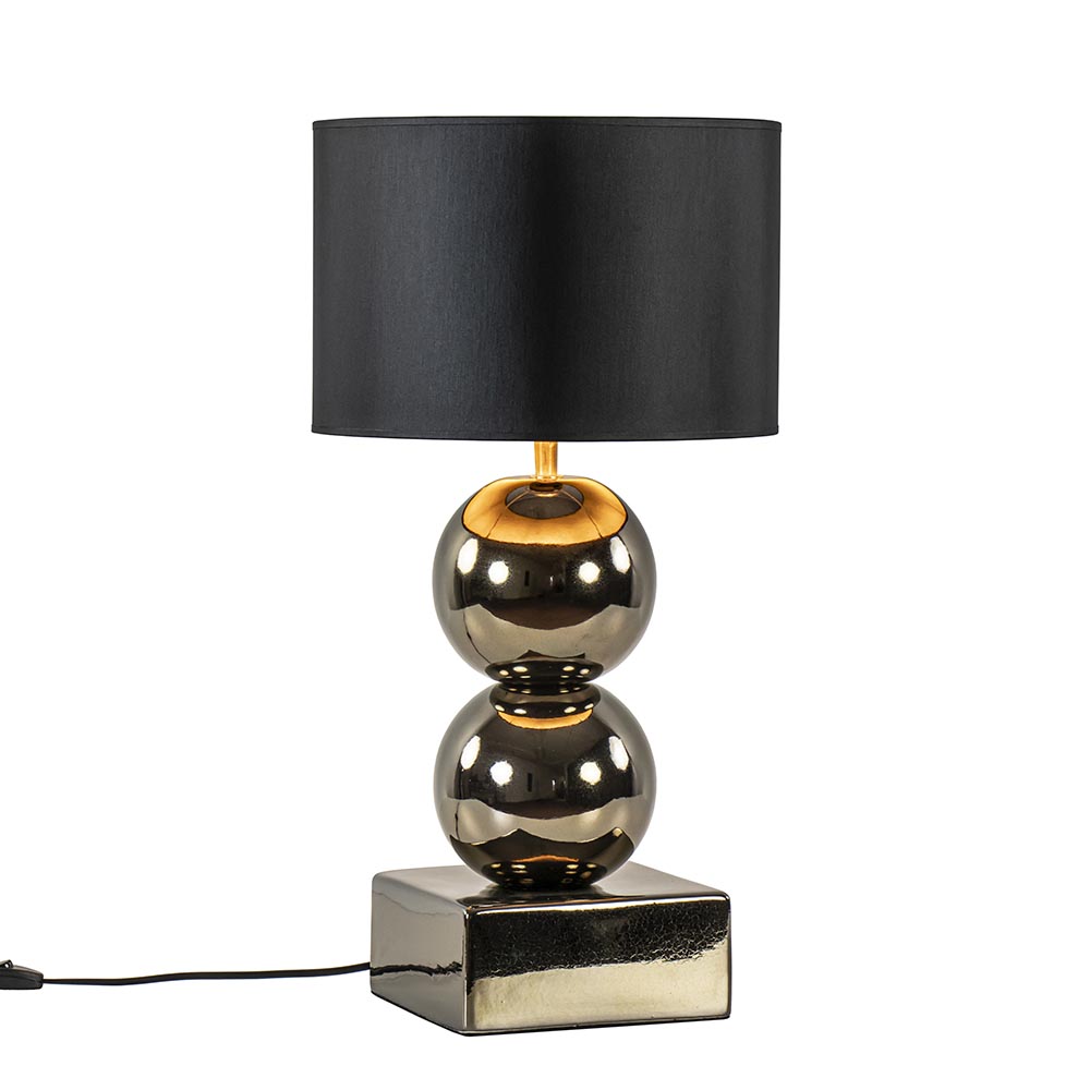 Een elegante toevoeging voor een strak klassiek of hotel chic interieur. De lampvoet is volledig gemaakt van keramiek en is uitgevoerd in het goud. Dit geeft de tafellamp een luxe uitstraling die compleet wordt gemaakt door de ronde kap in het zwart/goud. Deze wordt ondersteund door een fitting met kogelgewricht zodat u de kap gemakkelijk recht kunt zetten. De tafellamp met bollen is voorzien van een zwart snoer met een lengte van 140 cm. De schakelaar bevindt zich op 20 cm van de voet. De chique tafellamp met kap wordt exclusief lichtbron geleverd.