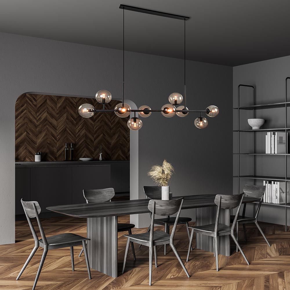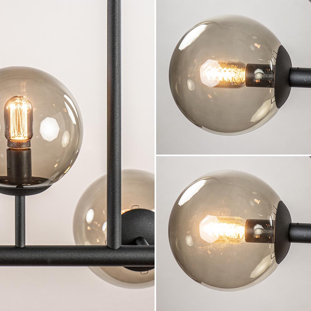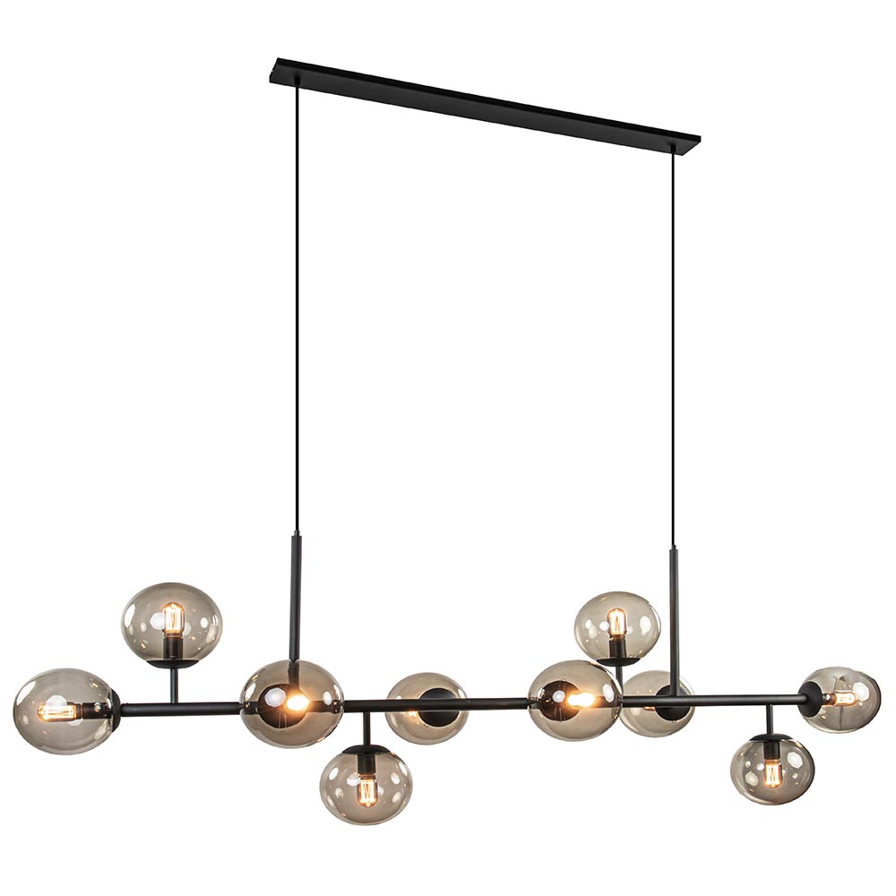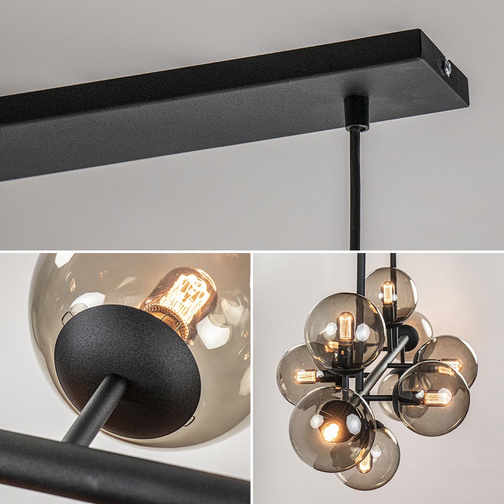 Retro in een modern jasje. Deze grote eettafelhanglamp is mooi toe te passen in diverse woonstijlen. De hanglamp bestaat uit een metalen frame dat is afgewerkt met een zwarte finish. Over het armatuur zijn op diverse plekken fittingen geplaatst waar de smoke glazen kappen op worden bevestigd. Deze hangen met vier veertjes vast aan de fitting zodat ze goed strak op het armatuur aansluiten en niet los kunnen raken. De zwarte kap met smoke glas hangt aan twee snoeren die naar wens zijn in te korten. De hanglamp heeft een maximale hoogte van 150 cm. De bevestiging is net als het armatuur afgewerkt met een zwarte finish en heeft een lengte van 100 cm. De 10-lichts glazen hanglamp is mooi te combineren boven een lange rechthoekige of ovale tafel.