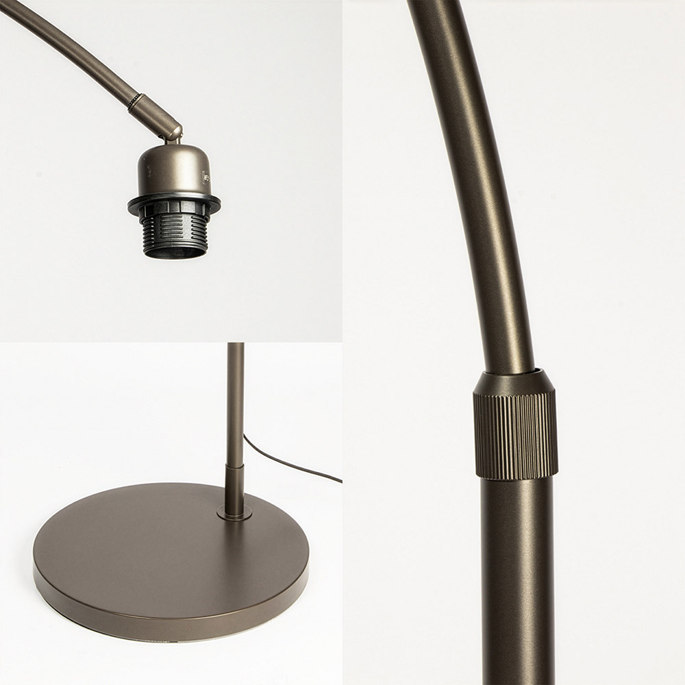 De stevige ronde voet met een diameter van 45 cm zorgt voor optimale stabiliteit, terwijl de hoge en brede boog de lamp perfect maakt om boven een fauteuil, bank of grote zithoek te plaatsen. De anodic brown afwerking geeft de lamp een luxe, eigentijdse uitstraling.
