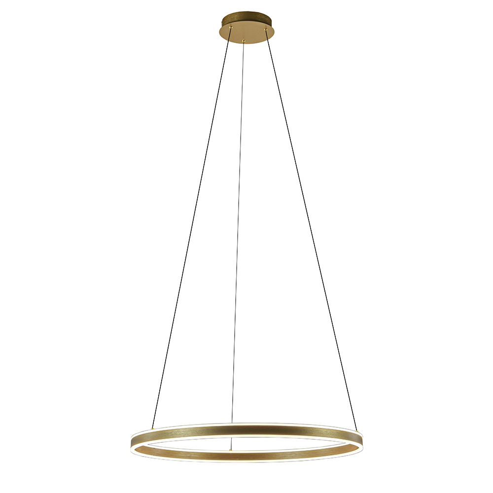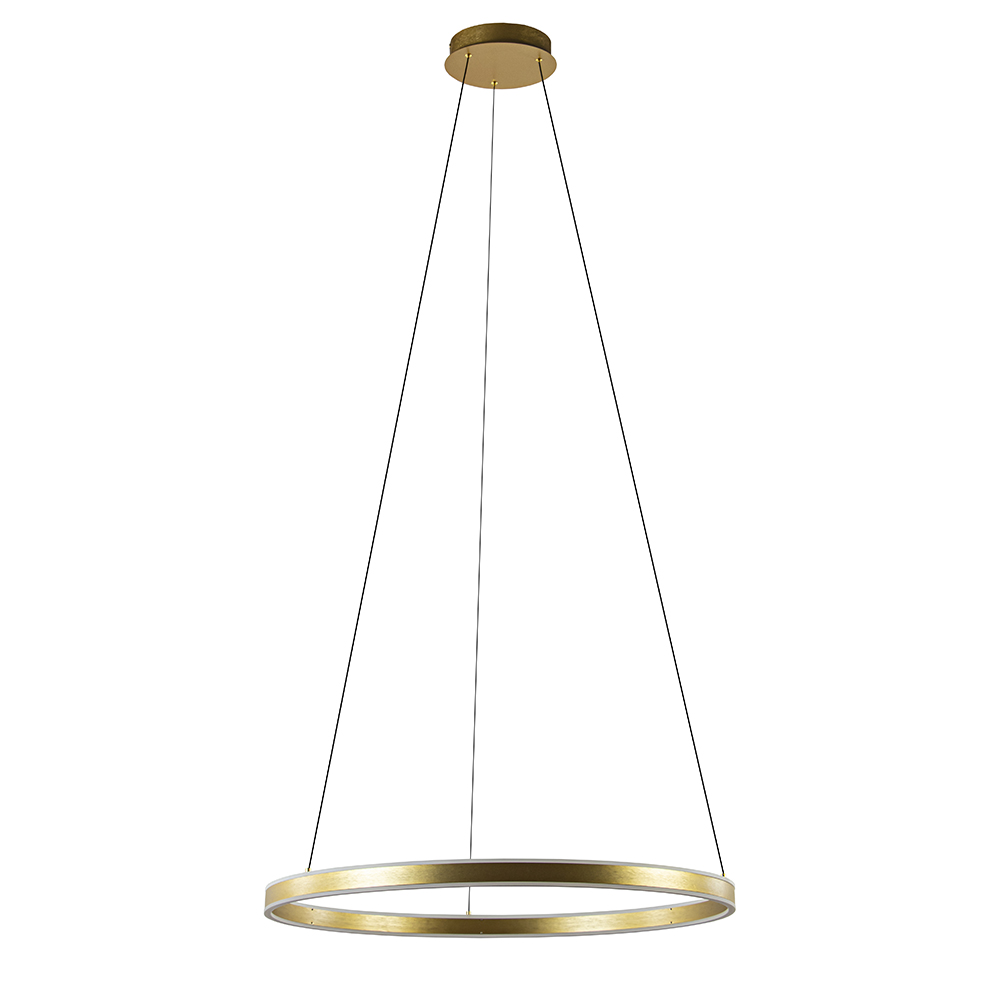 Deze moderne hanglamp heeft een minimalistisch design maar zorgt wel voor een groots effect in de ruimte. De LED hanglamp heeft een ronde kap met een doorsnede van maar liefst 80 cm. In de ring zitten 2 LED strips verwerkt die zowel naar boven als beneden licht verspreiden. Dit maakt de hanglamp perfect geschikt voor een eetkamer of hal. De gouden ring hangt aan 3 smalle snoeren die naar wens zijn in te korten. De maximale hoogte van de moderne lamp is 200 cm en de hanglamp is dimbaar middels een externe dimmer (exclusief).